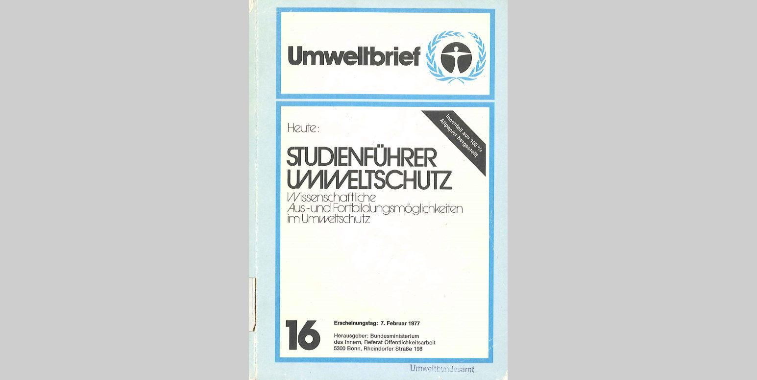 Das UBA veröffentlicht 1977 das erste Verzeichnis von Studiengängen an deutschen Universitäten und Fachhochschulen, die eine akademische Ausbildung im Bereich Umweltschutz bieten.