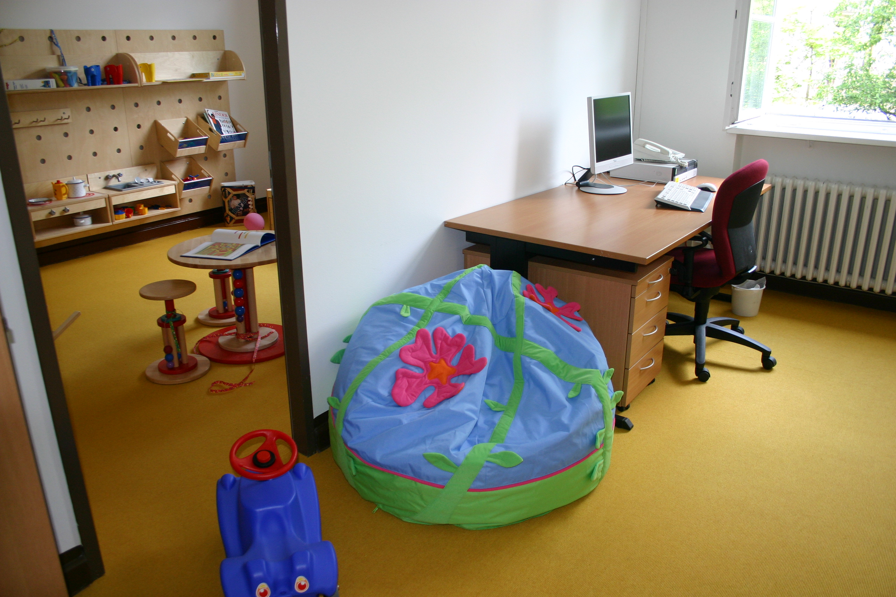Eltern-Kind-Zimmer in Berlin: Zwei Räume zum Arbeiten und Spielen mit Schreibtisch, Kindermöbeln und Spielzeug "Doppelzimmer" für Elternteil und Kind im UBA-Dienstgebäude Berlin-Bismarckplatz.