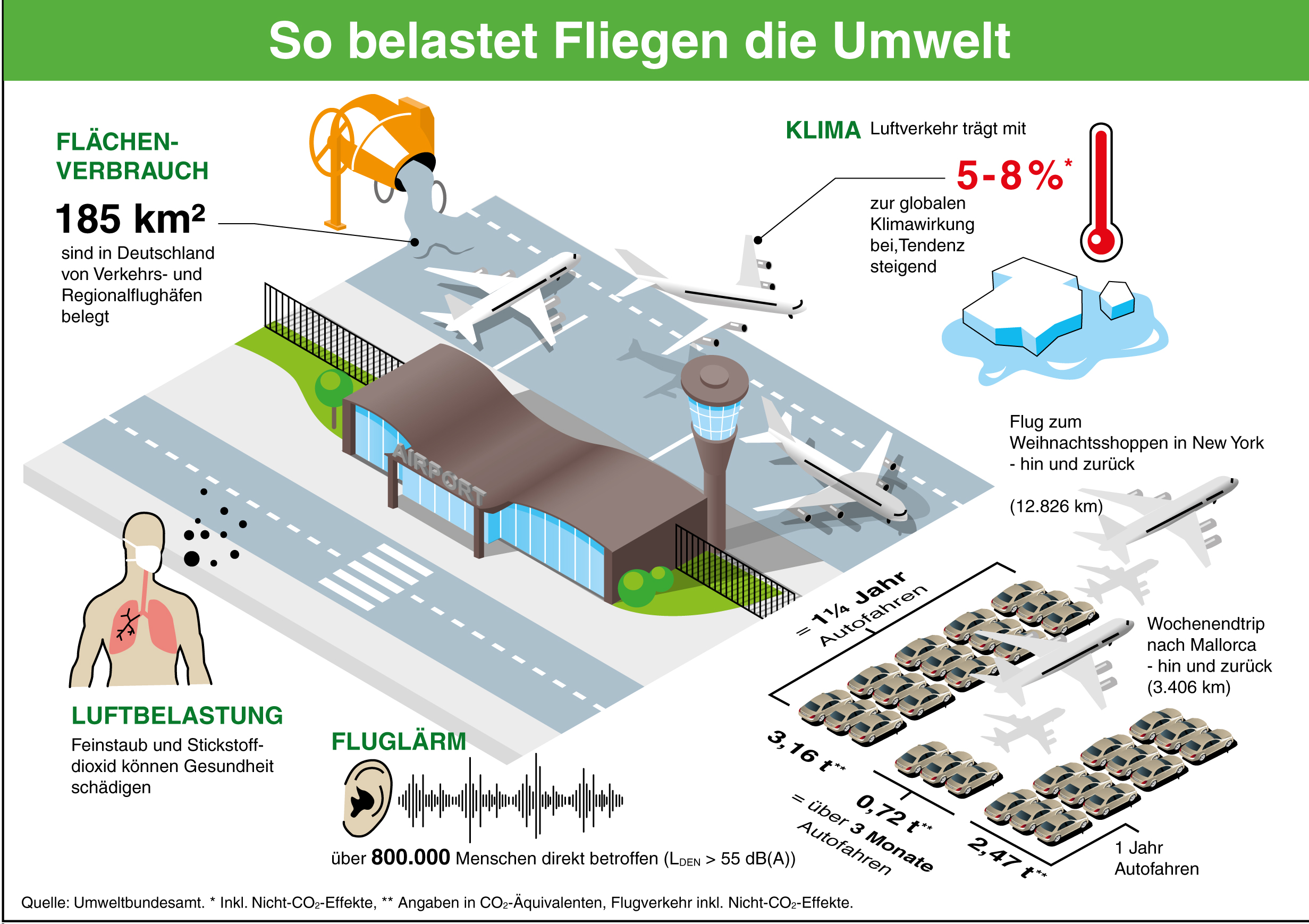 Ein „weiter so“ im Luftverkehr ist nicht möglich, macht das UBA 2019 klar. Denn sonst verfehlt Deutschland seine Klimaziele und bekommt auch den krank machenden Fluglärm nicht in den Griff. Wegen Billig-Tickets hat sich in Deutschland die Zahl der Fluggäste von 1990 bis 2018 verdreifacht. Unverständlich: Obwohl das Fliegen die umweltschädlichste Art der Fortbewegung ist, wird es massiv subventioniert: Allein im Jahr 2017, so das UBA, verzichtete der Staat auf 8,1 Milliarden Euro durch eine fehlende Kerosinbesteuerung und 4,2 Milliarden Euro durch eine Mehrwertsteuerbefreiung für grenzüberschreitende Flüge.