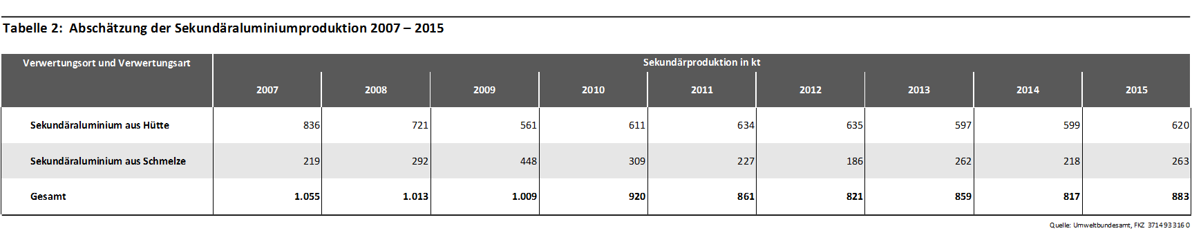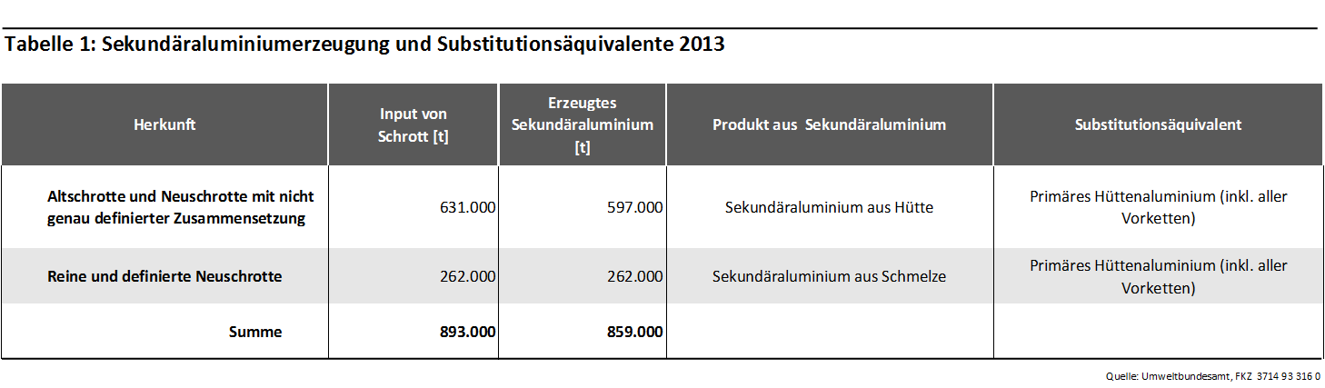 Die folgenden Tabellen geben die Sekundäraluminiumerzeugnisse in Deutschland aus inländischen Aluminiumschrotten, die zur Bilanzierung berücksichtigten Substitutionsäquivalente sowie eine Zeitreihe der angenommenen Verwertungsmengen wieder.
