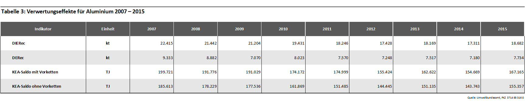 Tabelle 3: Verwertungseffekte für Aluminium 2007 – 2015 Tabelle 3: Verwertungseffekte für Aluminium 2007 – 2015