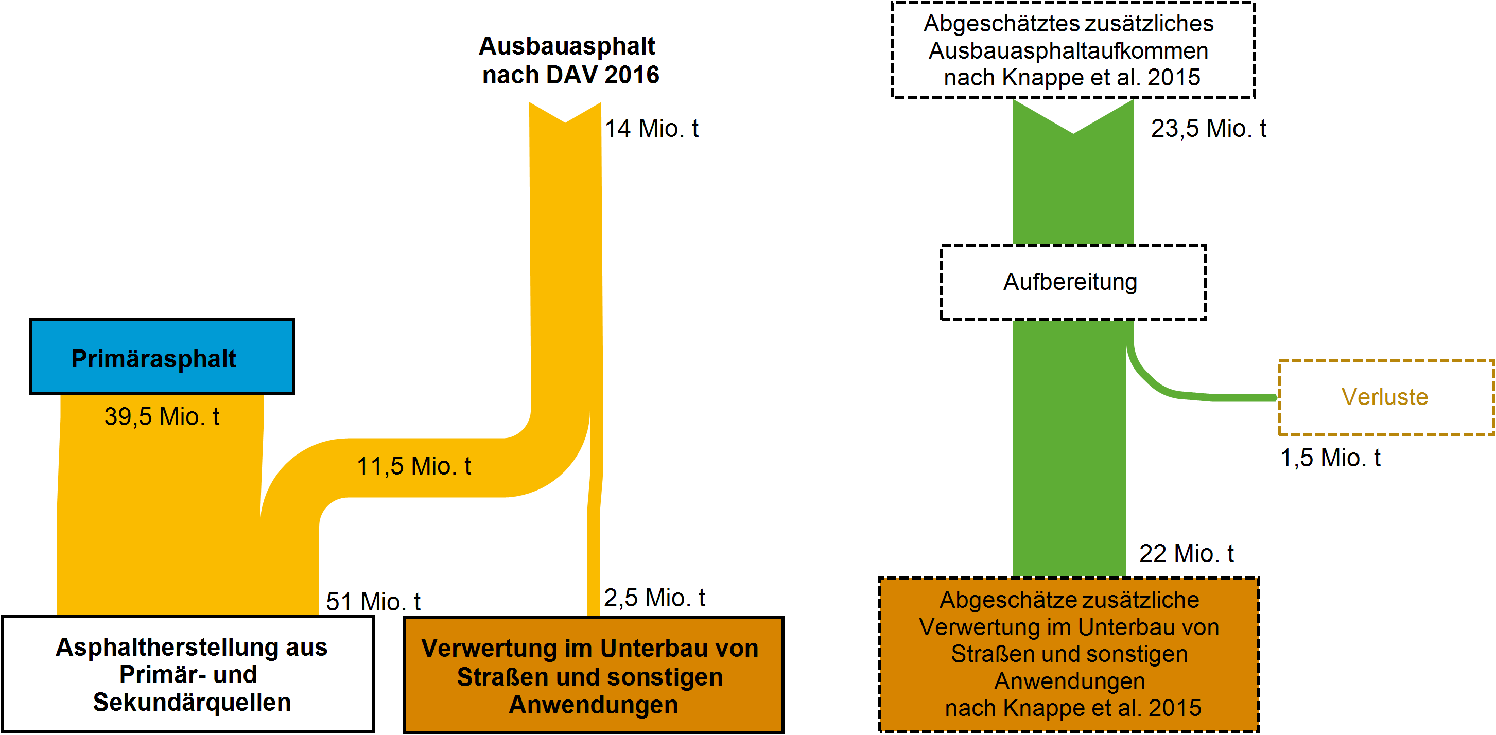 Das Haupteinsatzgebiet von Asphalt ist der Bau von Straßen und Verkehrsflächen. Daneben gibt es auch Anwendungen im Wasserbau und im Hochbau. Es besteht aus einem Bindemittel und mineralischen Gesteinskörnungen. Die im Asphalt eingesetzten Gesteinskörnungen bilden ein mineralisches Gerüst und sichern so die Tragfähigkeit des Baustoffs. Als Bindemittel kommen Straßenbaubitumen und polymermodifizierte Bitumen zum Einsatz. Allerdings wurde auch bis in die 1980er Jahre so genanntes Straßenpech eingesetzt, ein Destillat aus pyrolysierter Stein- und Braunkohle, das deutlich höhere Konzentrationen an polycyclischen aromatischen Kohlenwasserstoffen (PAK) enthält. Diese sind karcinogen und ihre Freisetzung muss beim Ausbau verhindert werden.
