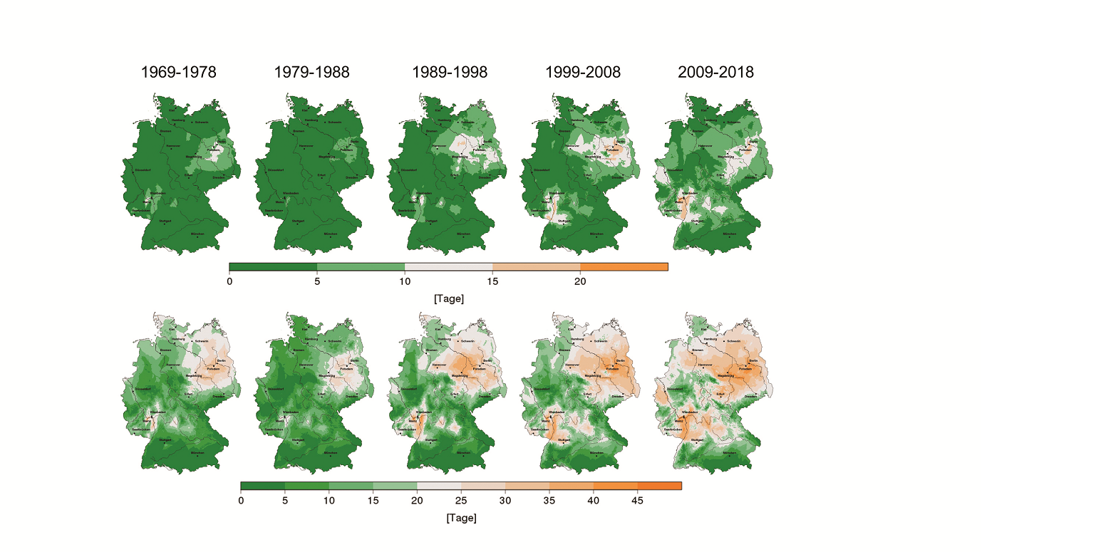 Mittlere jährliche Anzahl der Tage mit einer Bodenfeuchte unter 30 % nFK für Winterweizen auf einem schweren Boden (oben, sandiger Lehm) und einem leichten Boden (unten, lehmiger Sand)