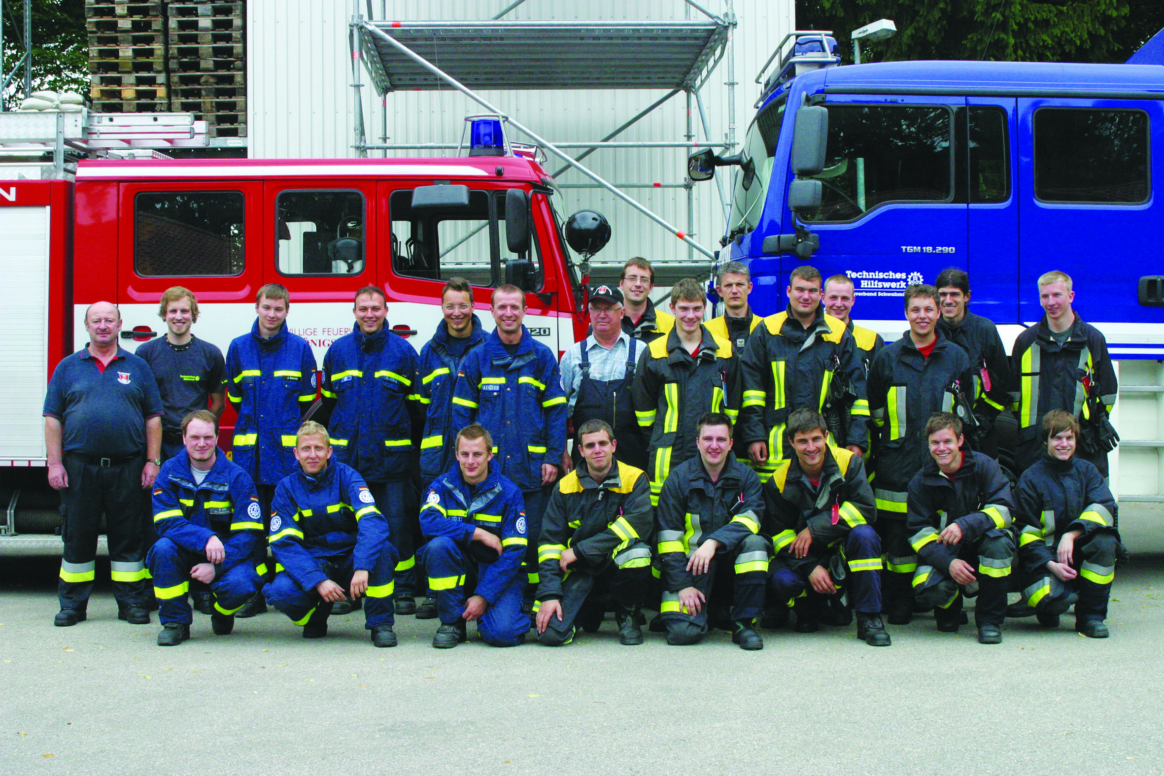 Einsatzkräfte in Uniformen des THW und einer Feuerwehr als Gruppenfoto vor ihren Einsatzfahrzeugen.