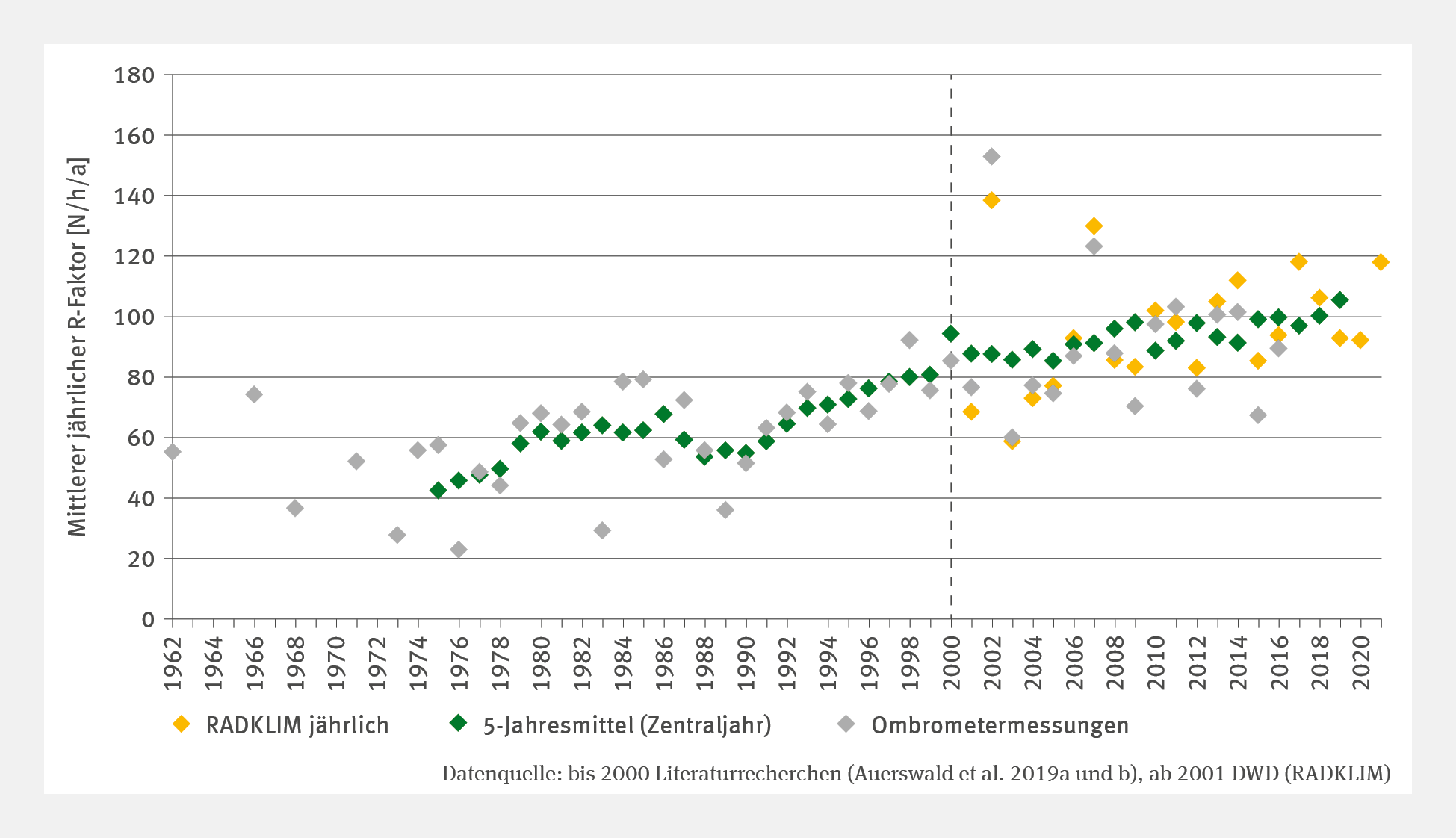 Quelle: bis 2000 Literaturrecherchen (Auerswald et al. 2019a und b)/ ab 2001 DWD (RADKLIM) Bild herunterladen (106,79 kB)