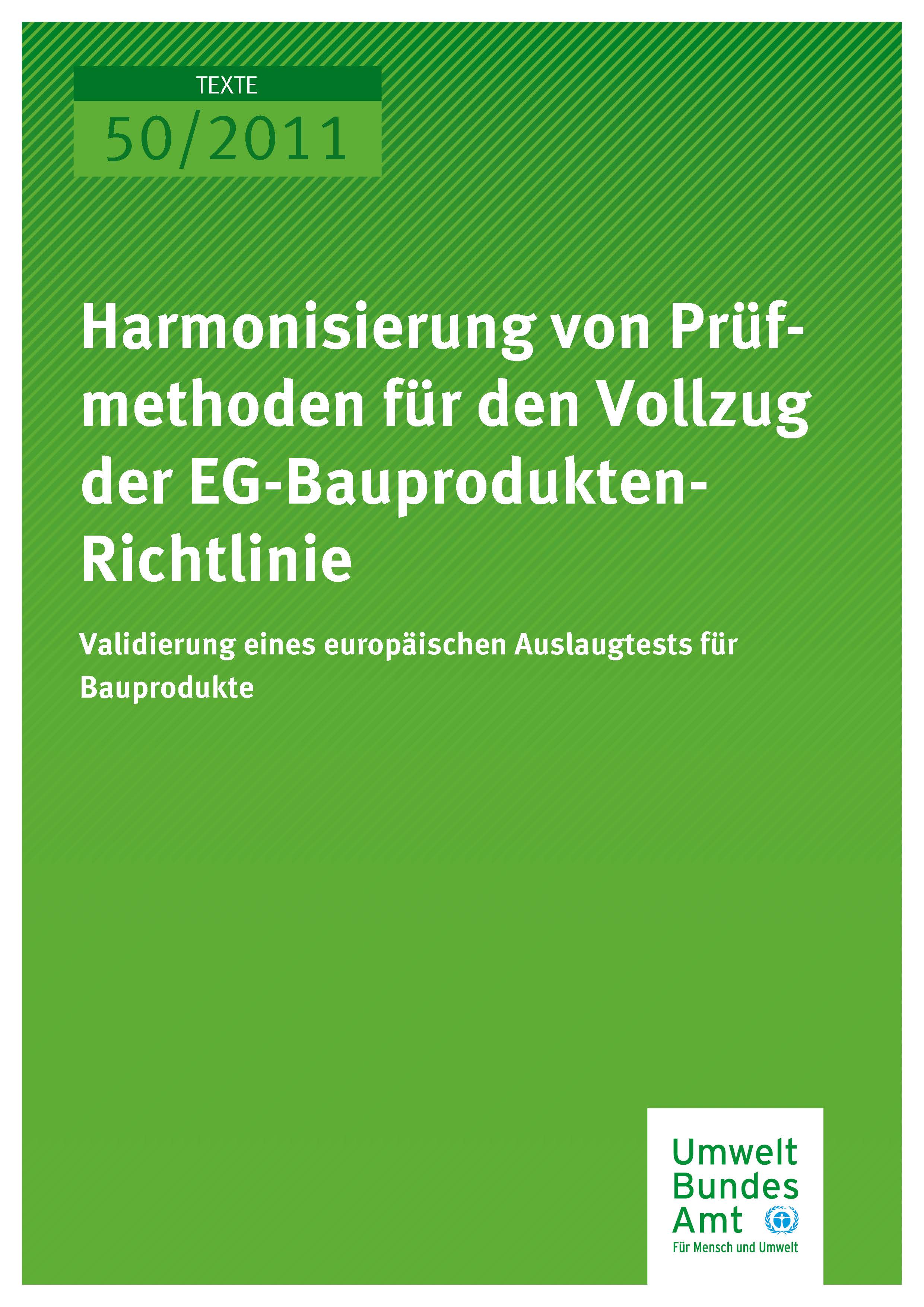 Publikation:Harmonisierung von Prüfmethoden für den Vollzug der EG-Bauprodukten- Richtlinie: Validierung eines europäischen Auslaugtests für Bauprodukte (Teilprojekt im Kontext eines europäischen Gemeinschaftsvorhabens)