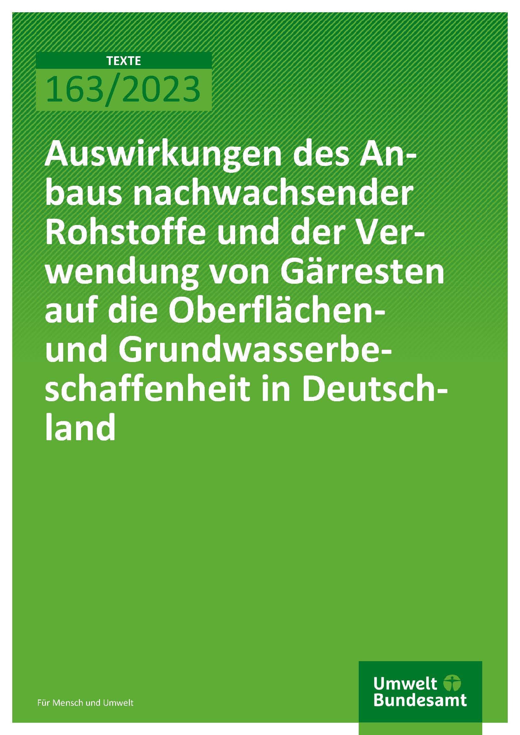 Cover des Berichts "Auswirkungen des Anbaus nachwachsender Rohstoffe und der Verwendung von Gärresten auf die Oberflächen- und Grundwasserbeschaffenheit in Deutschland"