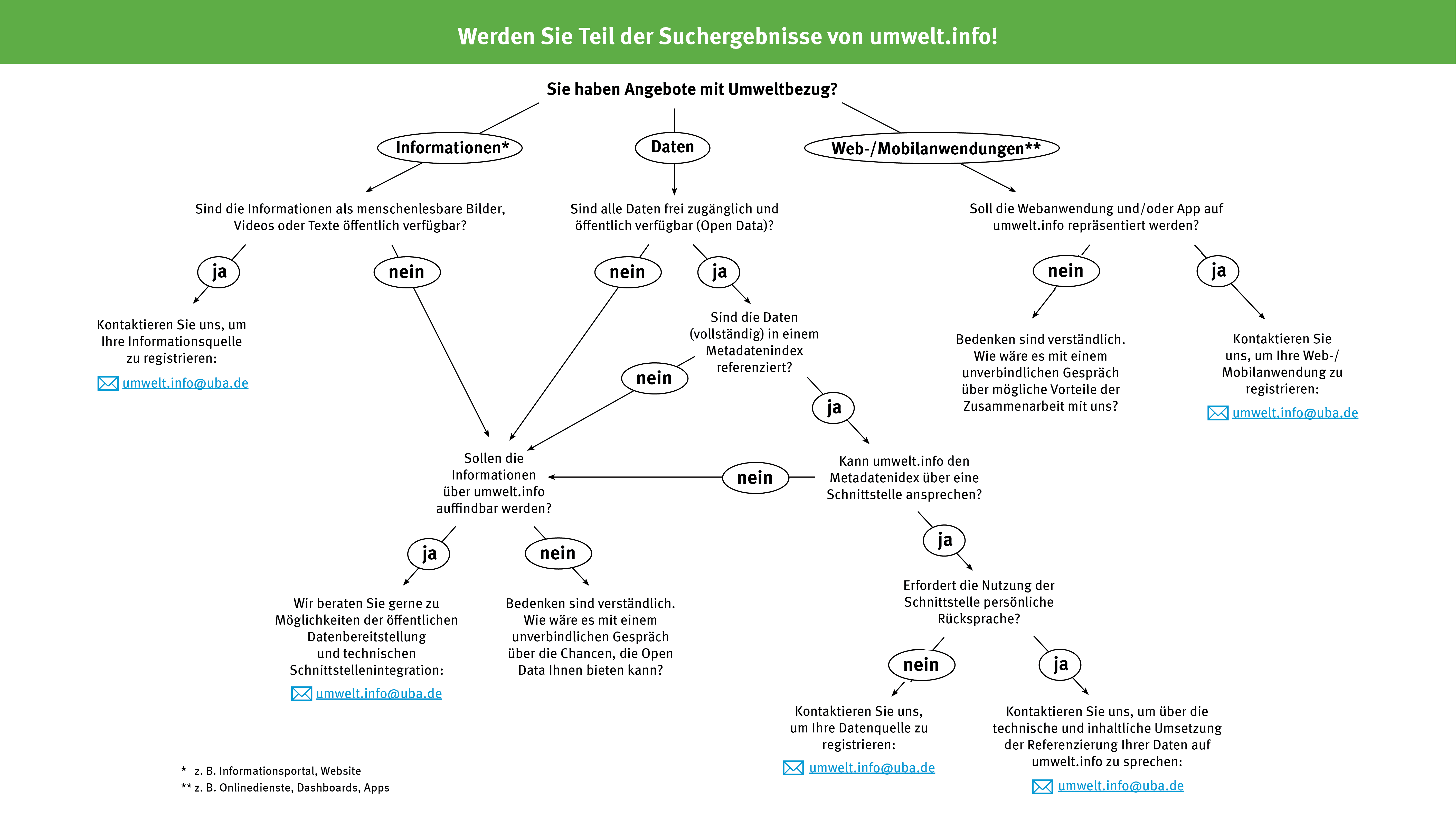 Durch Beantworten der Ja-Nein-Fragen erfahren Sie, wie Sie mit uns Kontakt aufnehmen und umwelt.info Ihr Daten- und informationsangebot mit Umwelt- oder Naturschutzbezug über Metadaten verfügbar machen kann. Melden Sie sich bei uns unter umwelt.info@uba.de!