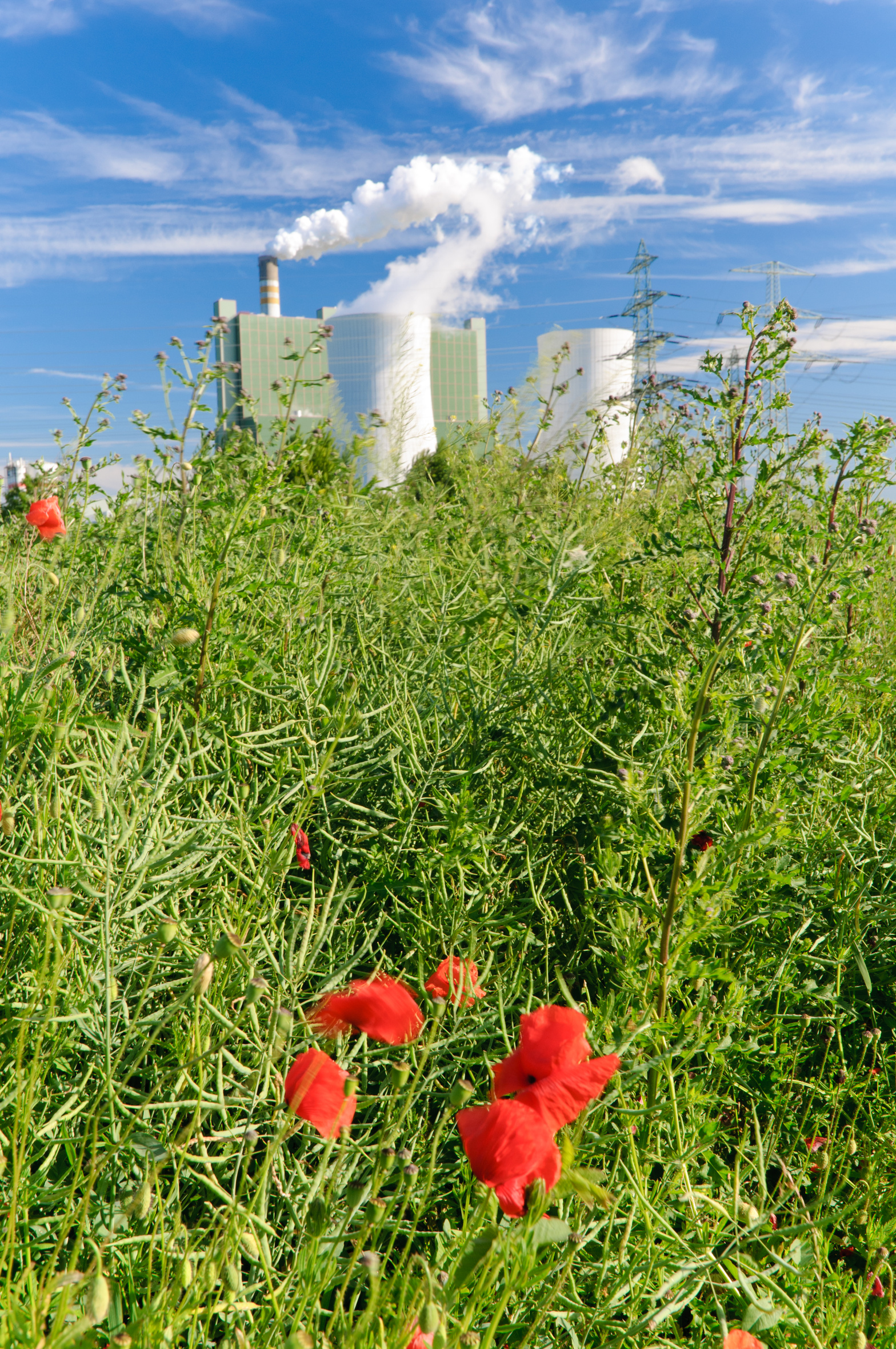 Heizkraftwerk und Mohnblumen