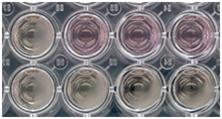 Nahaufnahme des In-vitro Micronucleus Tests mit rosanen und gelben Proben