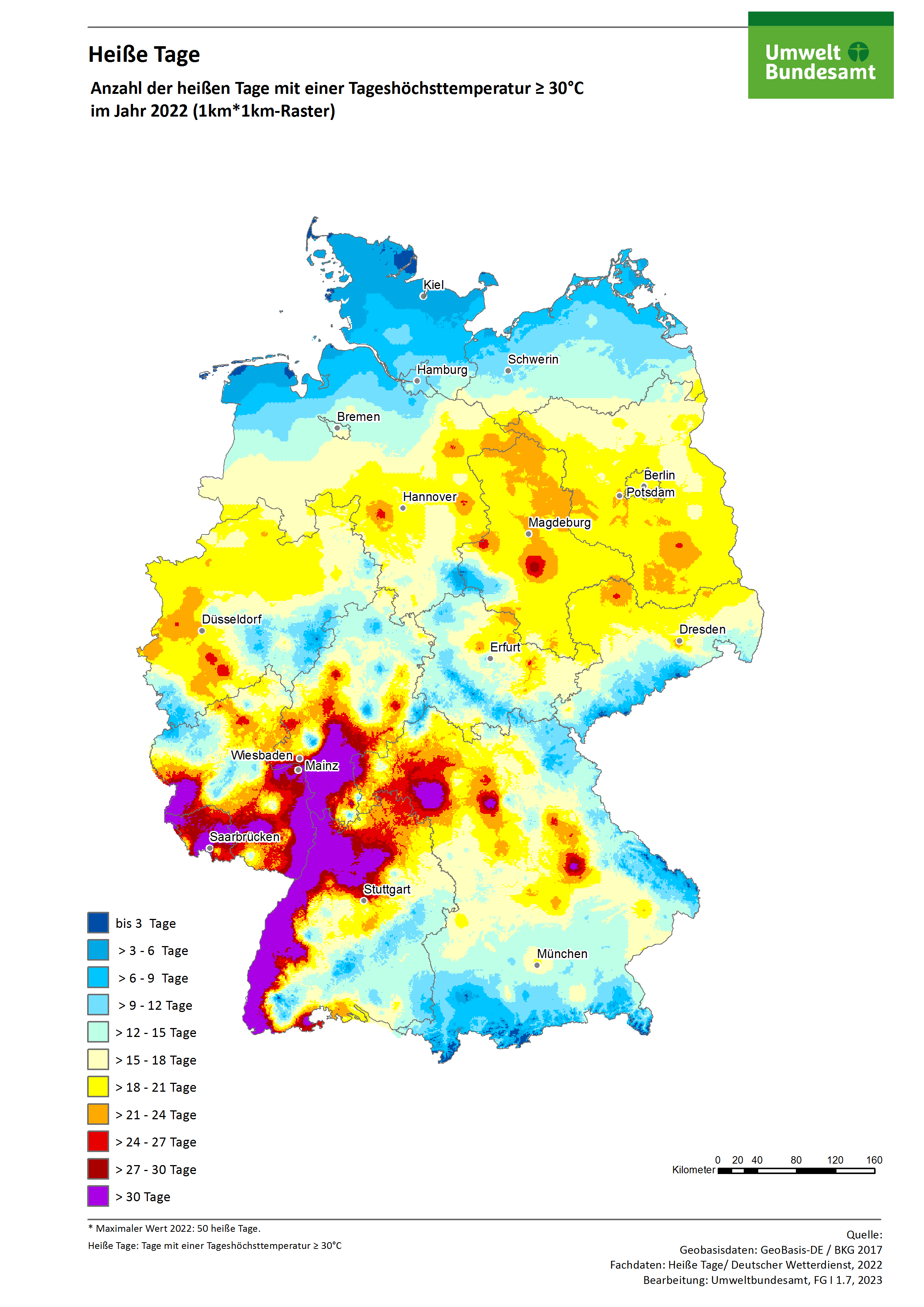 Karte: Heiße Tage - Anzahl der Heißen Tage mit einer Tageshöchsttemperatur >= 30°C im Jahr 2022