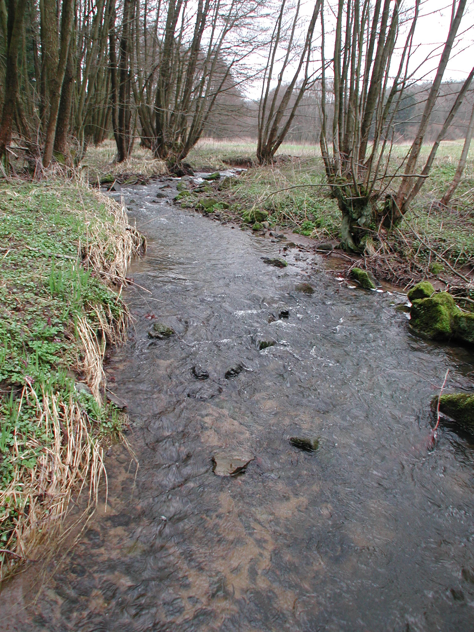 Ein kleiner Fluss umgegeben von kahlen Sträuchern