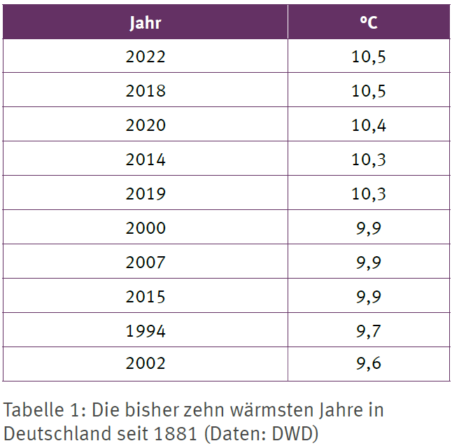 Die Tabelle zeigt die bisher zehn wärmsten Jahre in Deutschland seit 1881 (2002, 1994, 2015, 2007, 2000, 2019, 2014, 2020, 2018 und 2022).