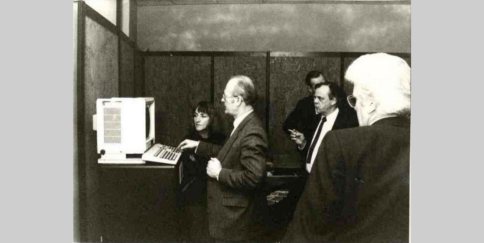 UBA-Präsident v. Lersner präsentiert das neue Angebot „Bildschirmtext (BTX)“ des Umweltbundesamtes