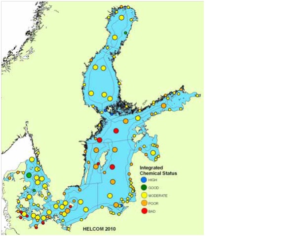 Abbildung: Integrierte Bewertung der Belastung der Ostsee mit gefährlichen Substanzen mit dem HELCOM Hazardous Substances Status Assessment Tool (CHASE). Große Punkte: Bewertungseinheiten im offshore-Bereich, kleine Punkte: Bewertungseinheiten in Küstengewässern (territoriale Gewässer) (HELCOM, 2010).