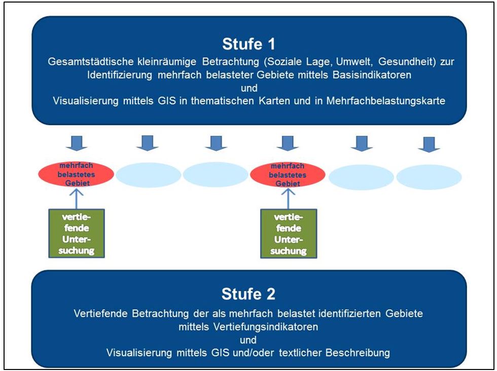 Grafische Darstellung des zweistufigen Verfahrens zur Identifizierung und Untersuchung mehrfach belasteter Gebiete des Forschungsprojekts "Umweltgerechtigkeit im städtischen Raum"