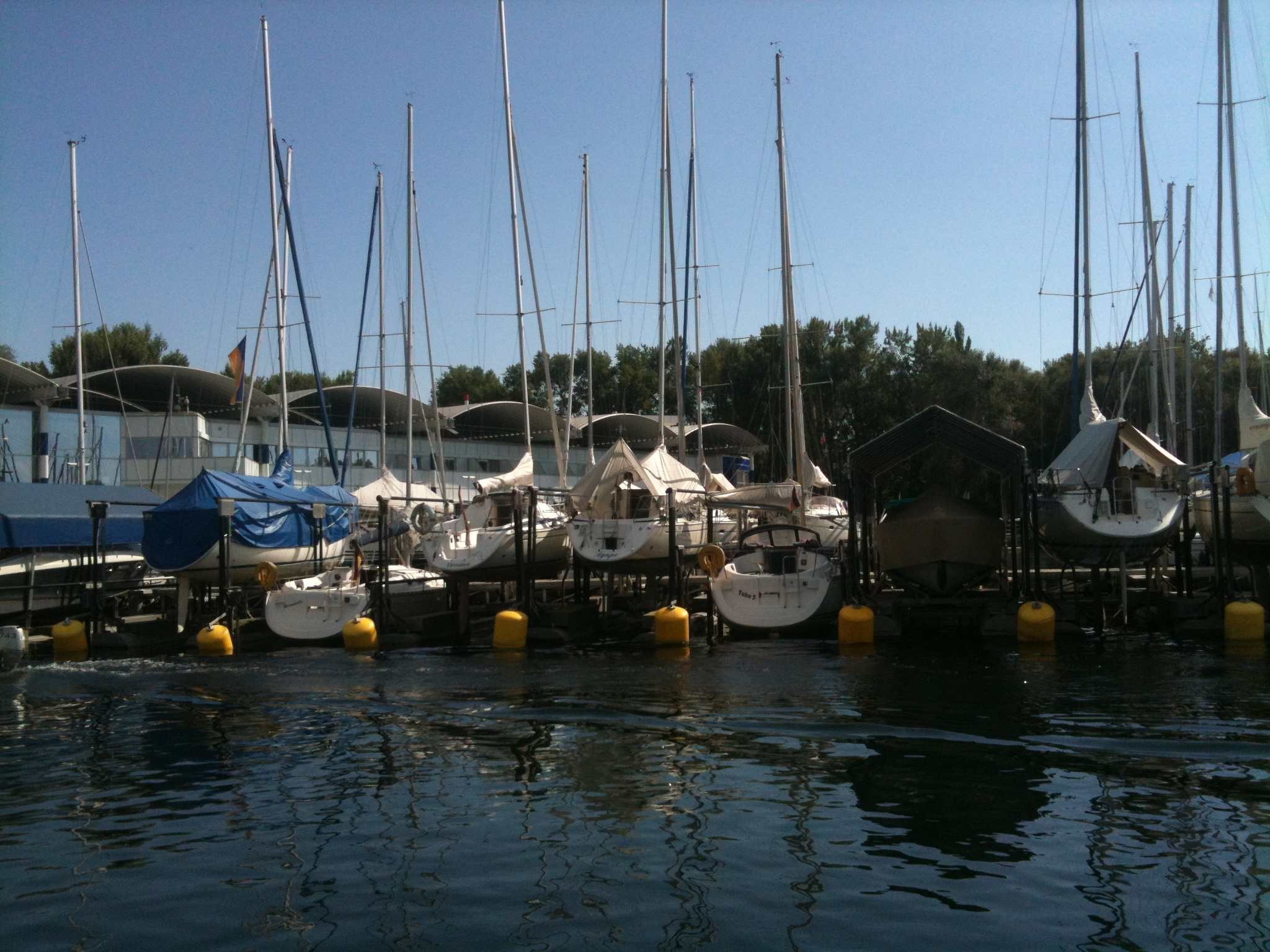 Als Teilaufgabe innerhalb des EU-Forschungsprojekts CHANGE [1] wurden auch Versuche mit Bootshebeanlagen durchgeführt. Im Folgenden soll eine kleine Auswahl aus überwiegend Binnenhäfen gezeigt werden, die als Anregung dienen können. Wegen der Anfälligkeit der Hebeanlagen gegen Starkwind und Wellenschlag finden sich die meisten Anlagen in Binnenrevieren. Die Hubanlagen dienen als Trockenliegeplätze, dennoch besitzen die meisten Boote zusätzlich eine biozidhaltige Antifouling-Beschichtung. Dieses ist durch das Herausheben des Bootes eigentlich nicht notwendig. Da es sich hier um Kielyachten handelt, bleibt der Kiel zumeist im Wasser und nur dieser müsste speziell gegen Bewuchs geschützt werden.