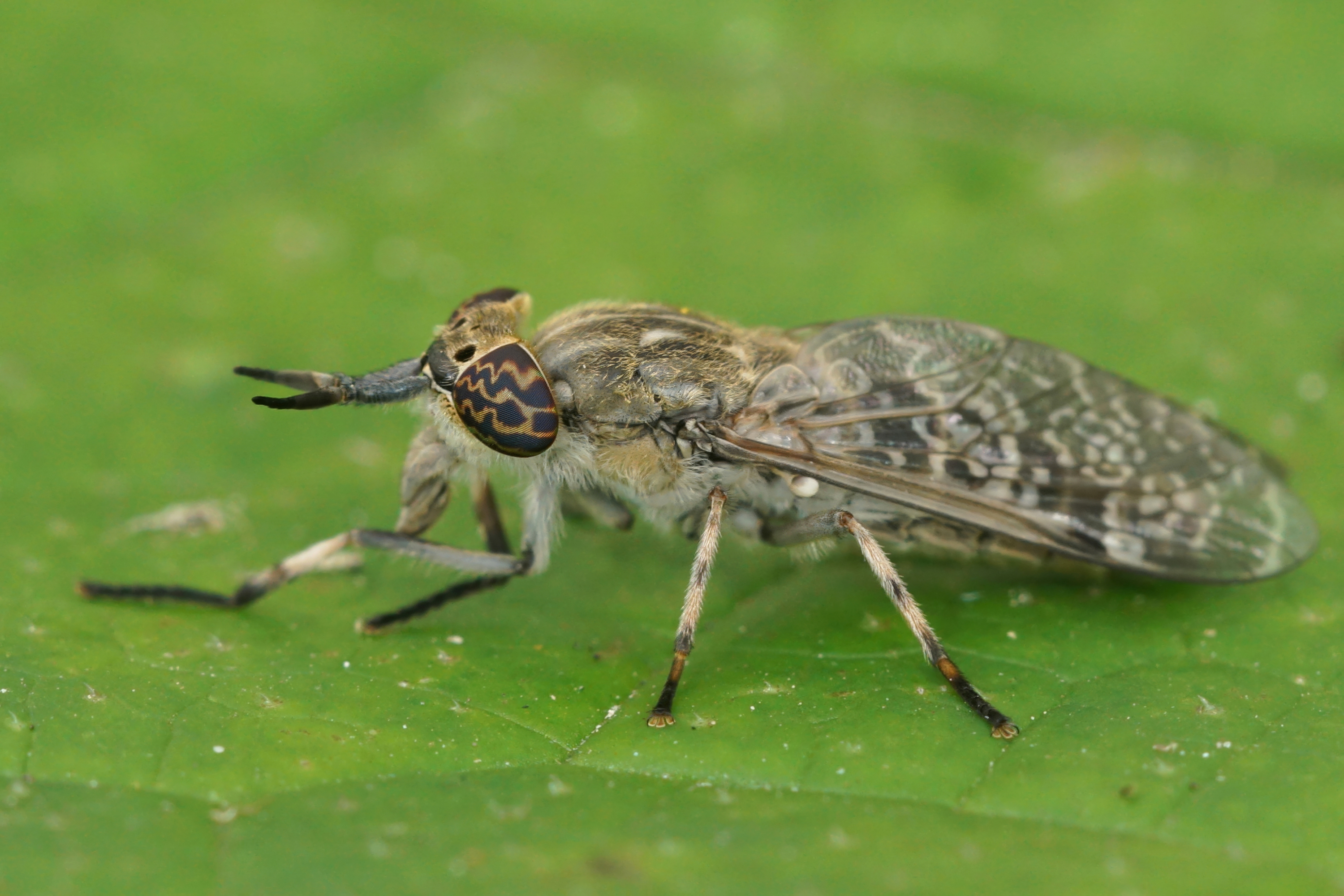 eine Regenbremse mit auffällig gemusterten Augen sitzt auf einem Blatt