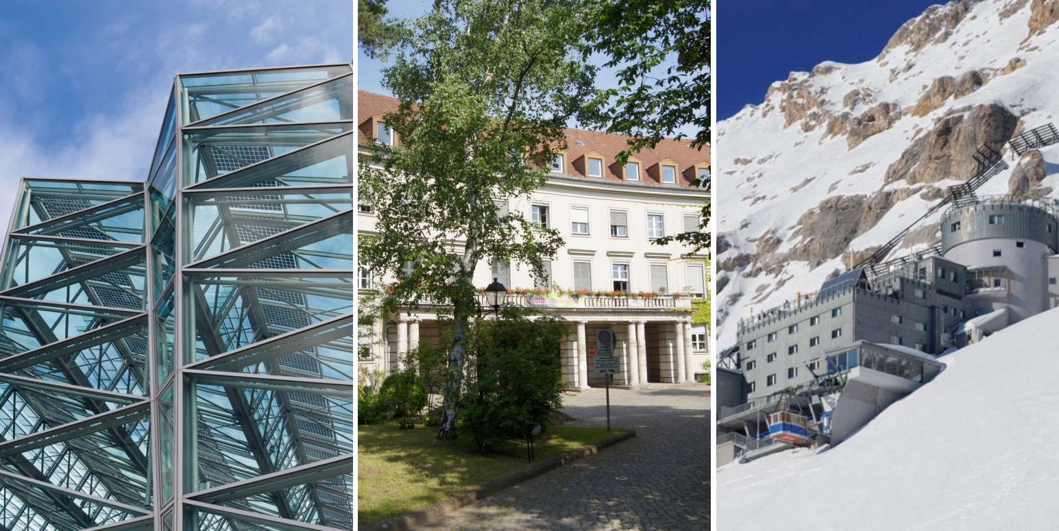 Collage aus 3 Gebäuden: Moderner Glasbau, Altbau im Grünen und Bergstation am schneebedeckten Berghang