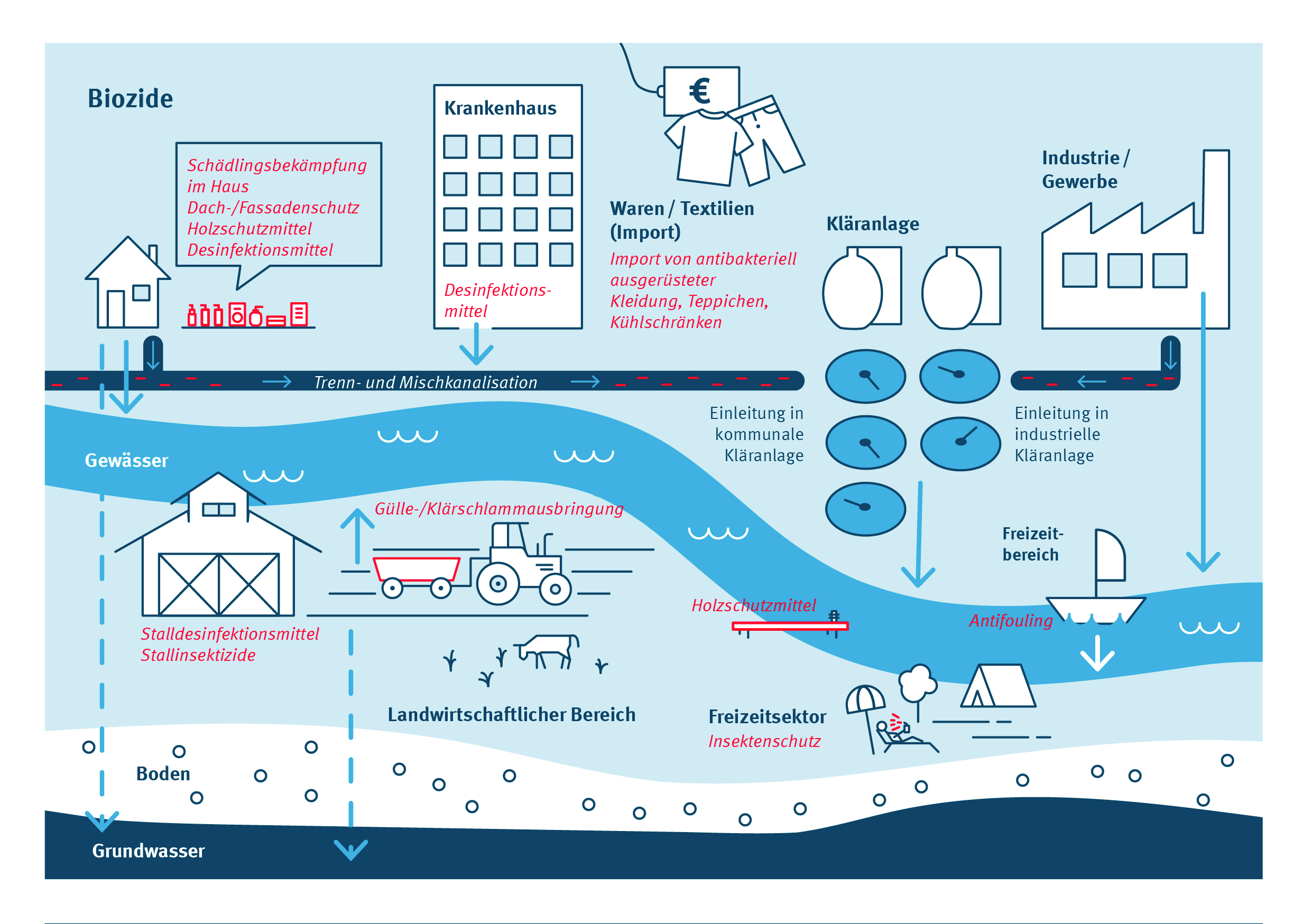 Biozide werden auch in Baumaterialien eingesetzt, zum Beispiel in Fassadenfarben oder Außenputzen, um diese vor einem unerwünschten Algen- oder Pilzbewuchs zu schützen. Durch den Regen werden diese Substanzen von den Fassaden abgespült und gelangen entweder zusammen mit dem häuslichen Schmutzwasser in die Mischkanalisation und anschließend in die Kläranlage, oder sie erreichen Oberflächengewässer über den Regenkanal direkt und oft unbehandelt.
