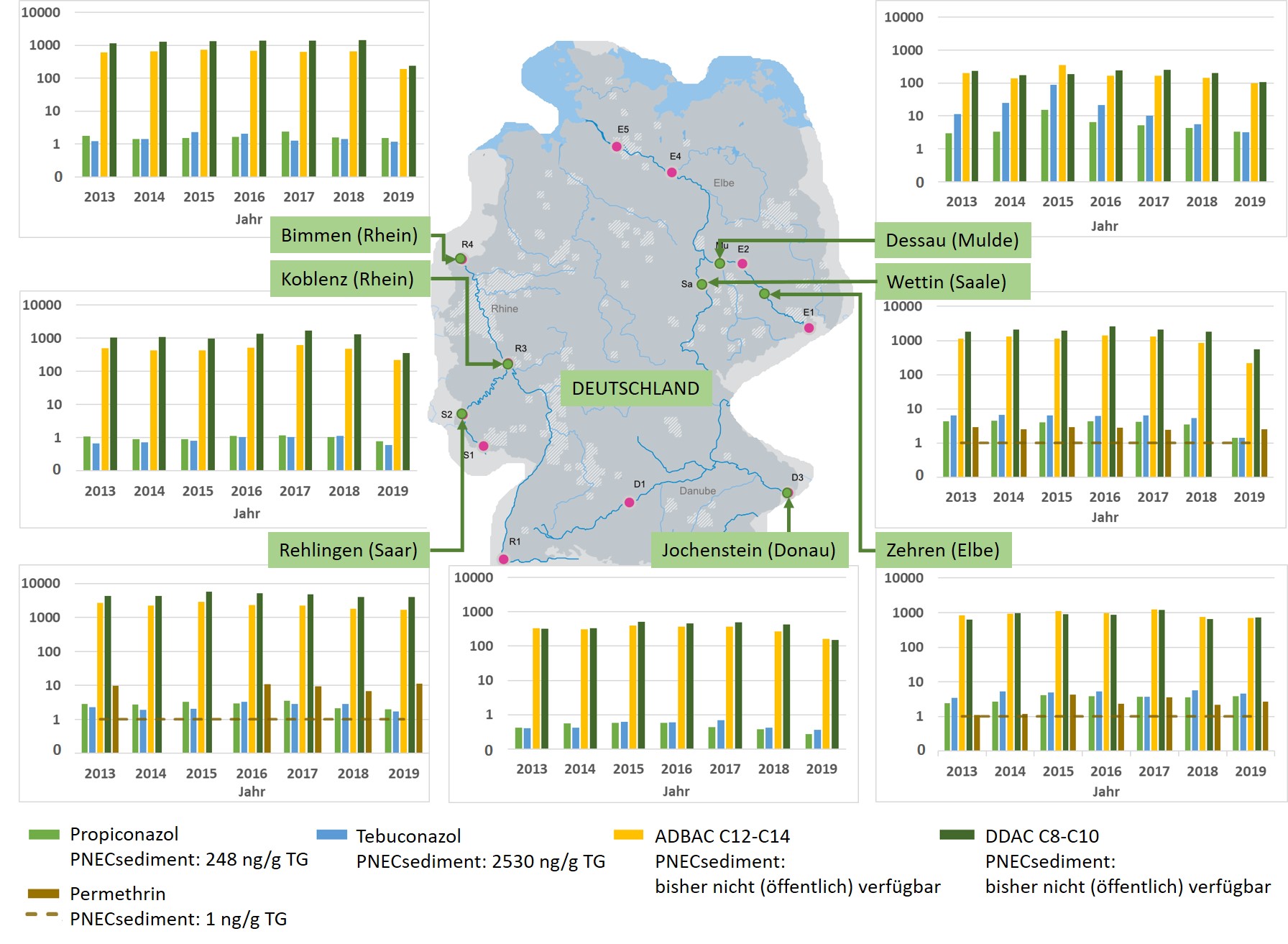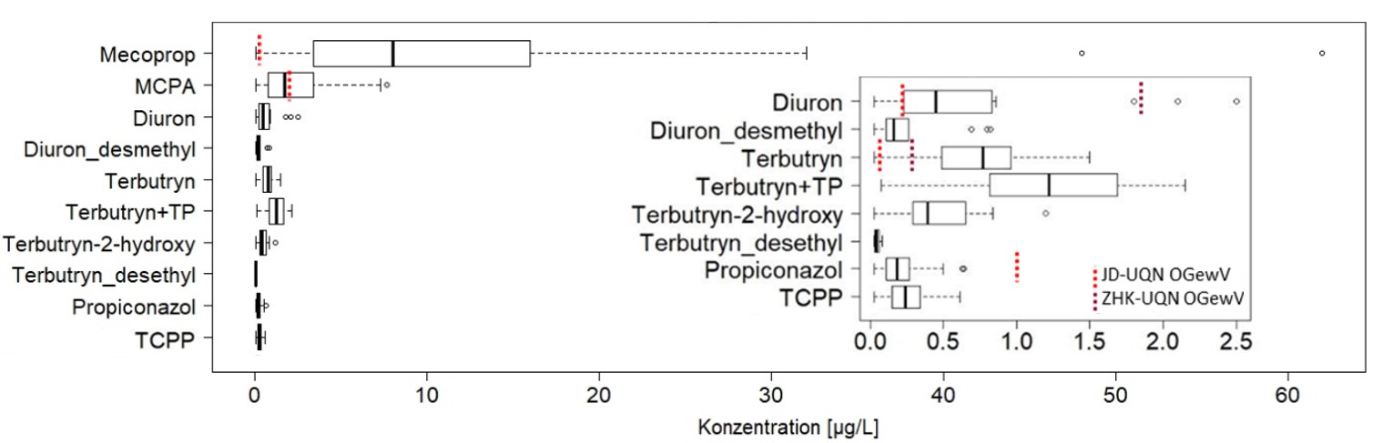 Anhand eines deutschlandweiten Kläranlagen-Monitoringprojektes konnte gezeigt werden, dass Biozide, die über die Kanalisation in die Kläranlage gelangen, nicht alle gleichermaßen eliminiert werden. Das Karlsruher Institut für Technologie (KIT) und das DVGW-Technologiezentrum Wasser (TZW) untersuchten im Auftrag des Umweltbundesamtes über einen Zeitraum von mehr als einem Jahr (11/2017-04/2019) 29 kommunale Kläranlagenabflüsse auf 26 Biozidwirkstoffe und Transformationsprodukte. Vor allem Substanzen aus dem Bereich der Materialschutzmittel und Insektizide wurden im Kläranlagenablauf wiedergefunden (siehe Abb. „Kläranlagenmonitoring“). Teilweise lagen die Konzentrationen hierbei über dem jeweiligen Umweltqualitätsparameter für die Gewässer.