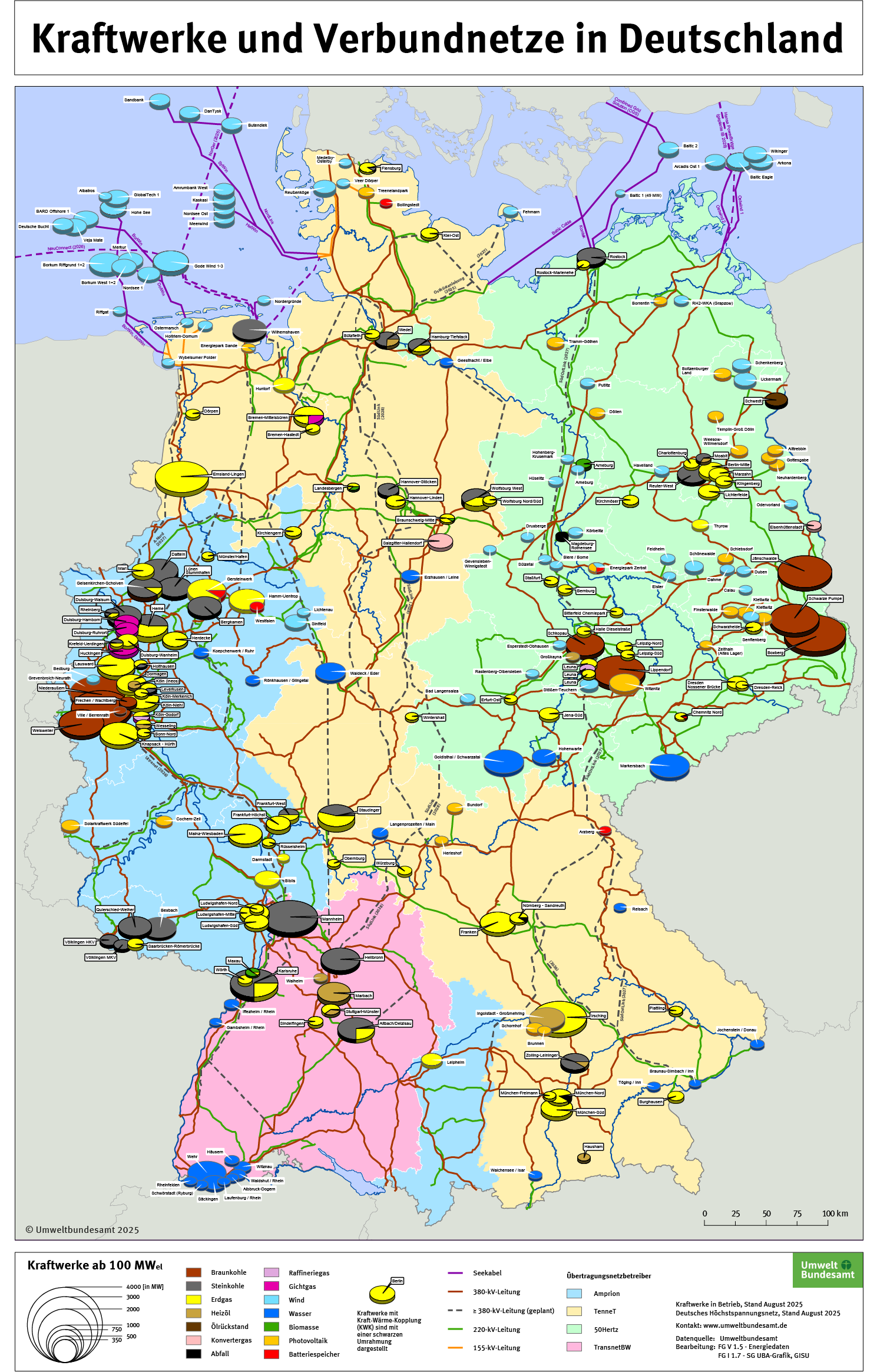 Kraftwerke und Verbundnetze in Deutschland, Stand August 2025.