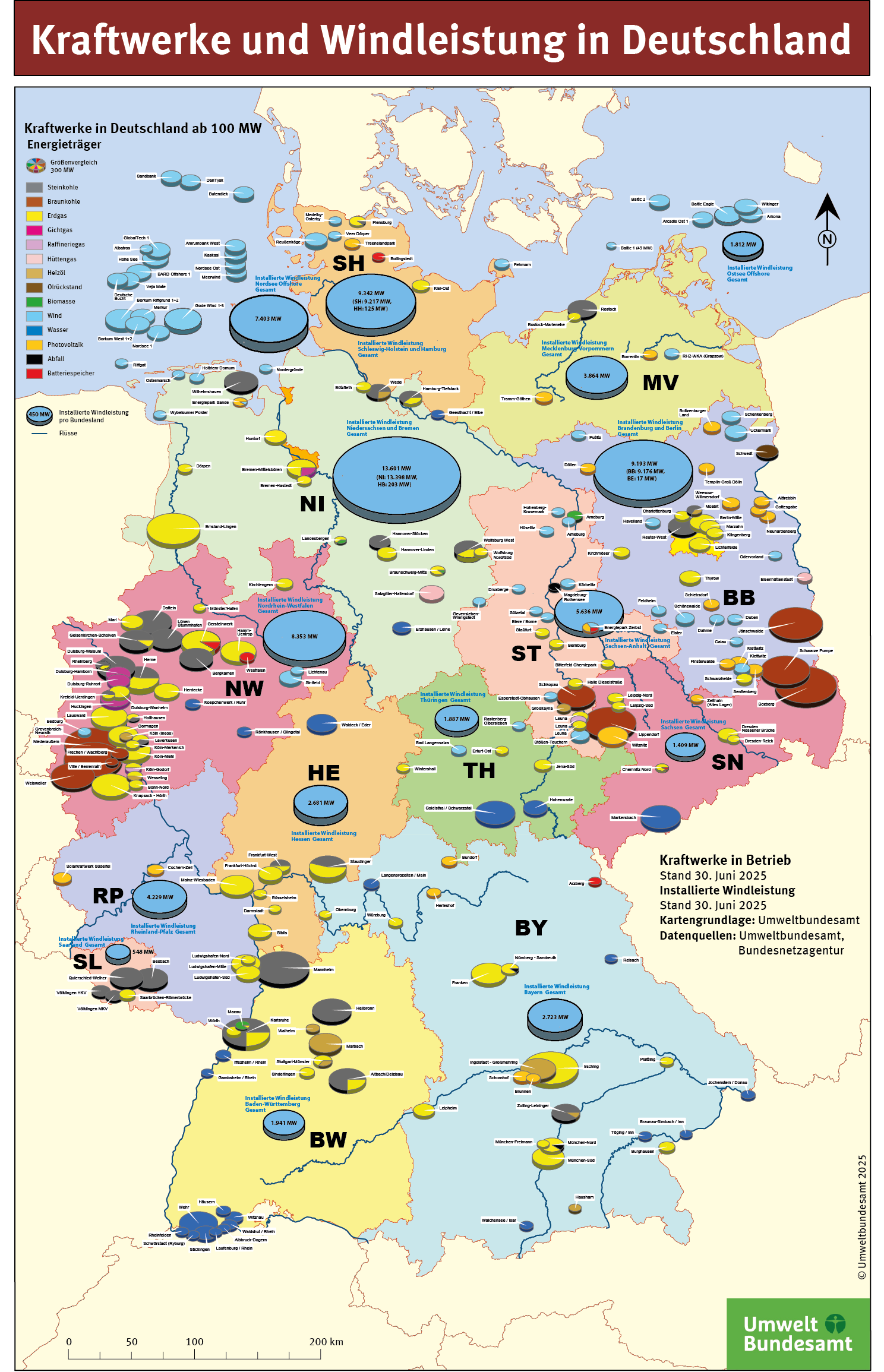 Karte Kraftwerke und Windleistung in Deutschland, Stand Juni 2025
