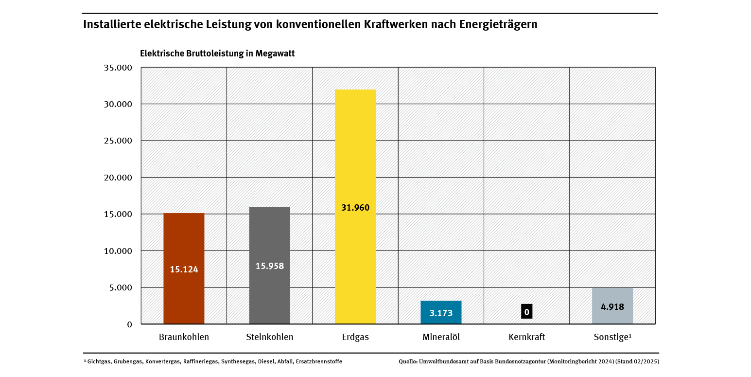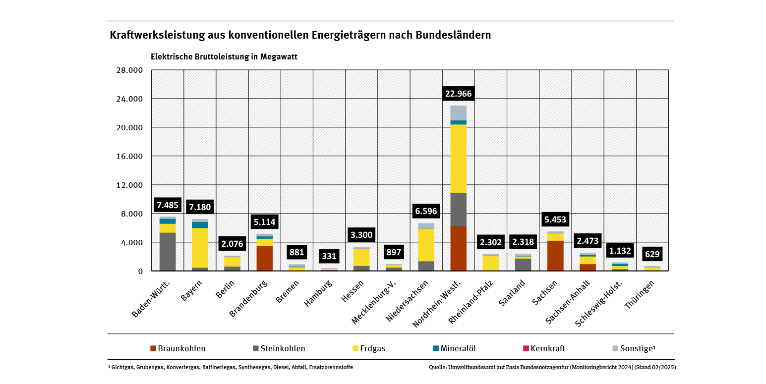Der deutsche Kraftwerkspark beruhte vor der Energiewende vor allem auf konventionellen Erzeugungsanlagen auf Grundlage eines breiten, regional diversifizierten, überwiegend fossilen Energieträgermixes (Stein- und Braunkohlen, Kernenergie, Erdgas, Mineralölprodukte, Wasserkraft etc.). Die gesamte in Deutschland installierte Brutto-Leistung konventioneller Kraftwerke ist basierend auf Daten des Umweltbundesamtes in der Abbildung „Installierte elektrische Leistung von konventionellen Kraftwerken ab 10 Megawatt nach Energieträgern“ dargestellt. Die aktuelle regionale Verteilung der Kraftwerkskapazitäten ist in der Abbildung „Kraftwerksleistung aus konventionellen Energieträgern ab 10 Megawatt nach Bundesländern“ dargestellt.