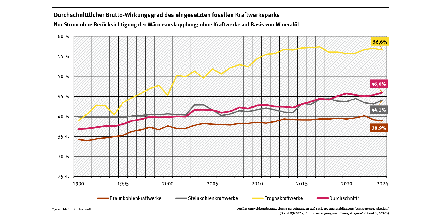 Beim Brutto-Wirkungsgrad ist im Vergleich zum Netto-Wirkungsgrad der Eigenverbrauch der Kraftwerke enthalten. Insgesamt verbesserte sich der durchschnittliche Brutto-Wirkungsgrad des eingesetzten deutschen Kraftwerksparks seit 1990 um einige Prozentpunkte (siehe Abb. „Durchschnittlicher Brutto-Wirkungsgrad des eingesetzten fossilen Kraftwerksparks“). Diese Entwicklung spiegelt nicht zuletzt die kontinuierliche Modernisierung des Kraftwerksparks und die damit verbundene Außerbetriebnahme alter Kraftwerke wider.