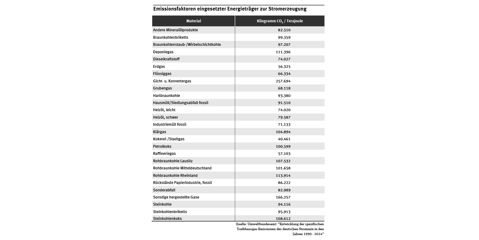 Tab: Emissionsfaktoren eingesetzter Energieträger zur Stromerzeugung