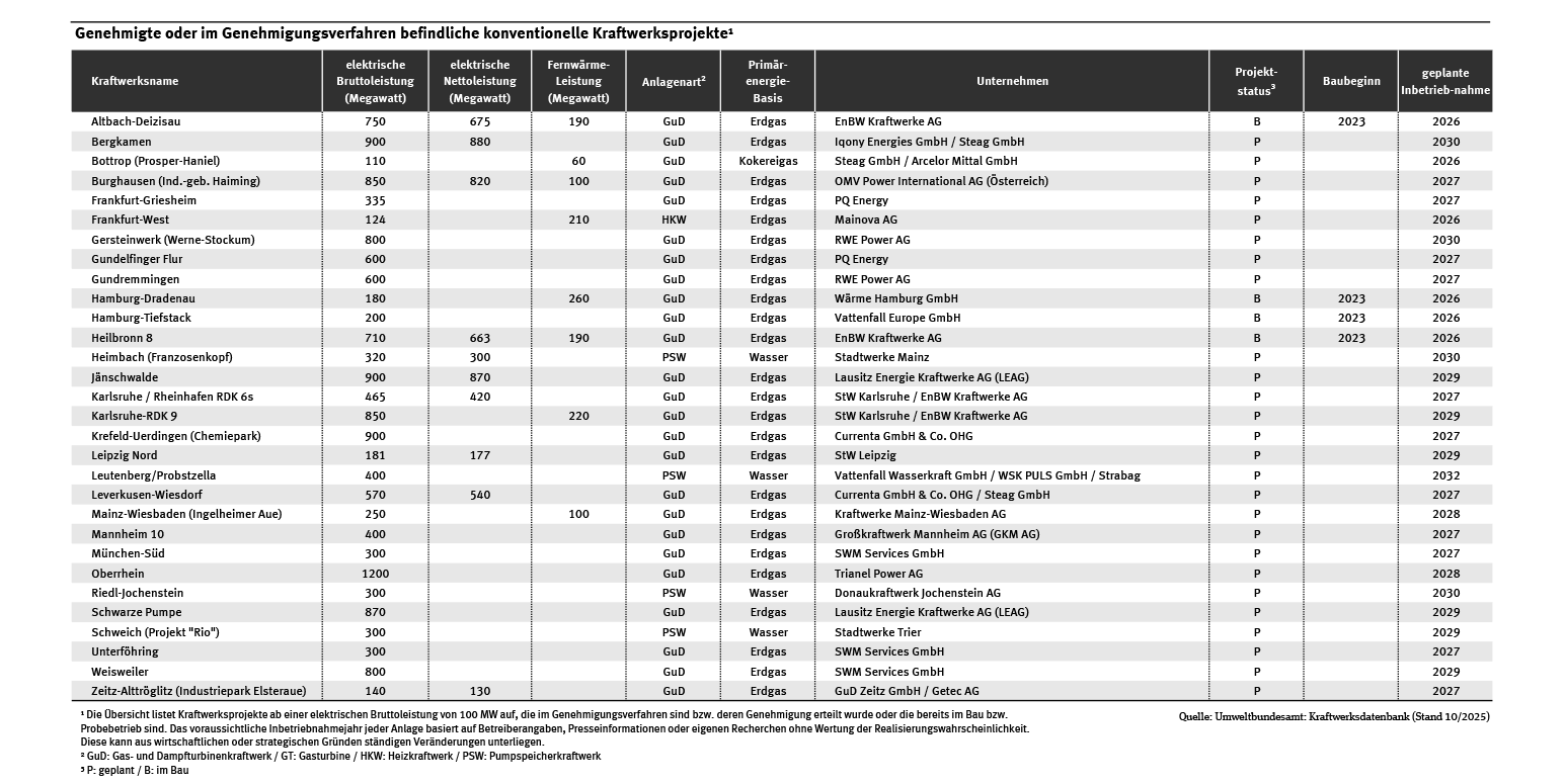 Tab: Genehmigte oder im Genehmigungsverfahren befindliche konventionelle Kraftwerksprojekte
