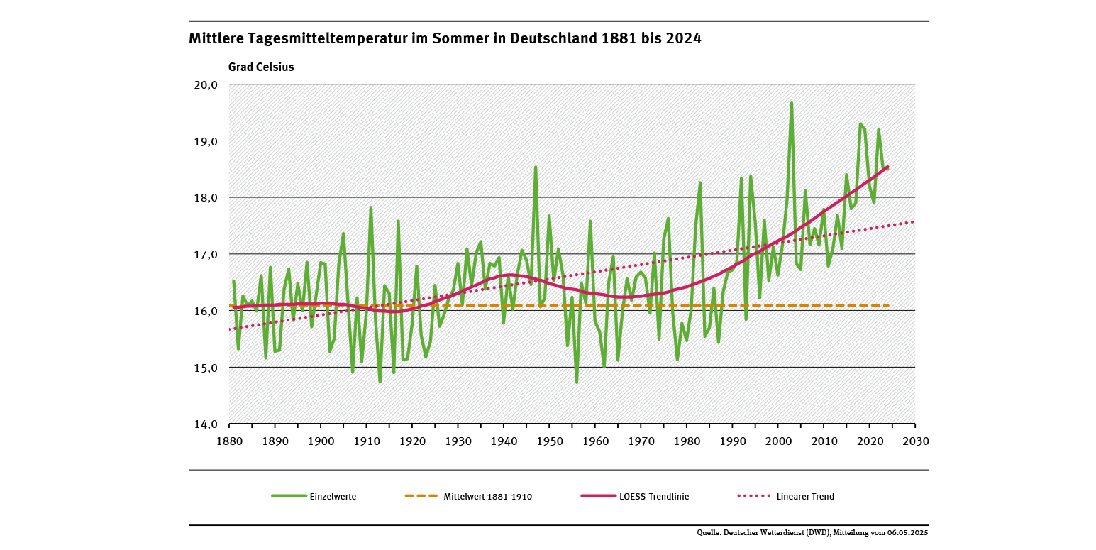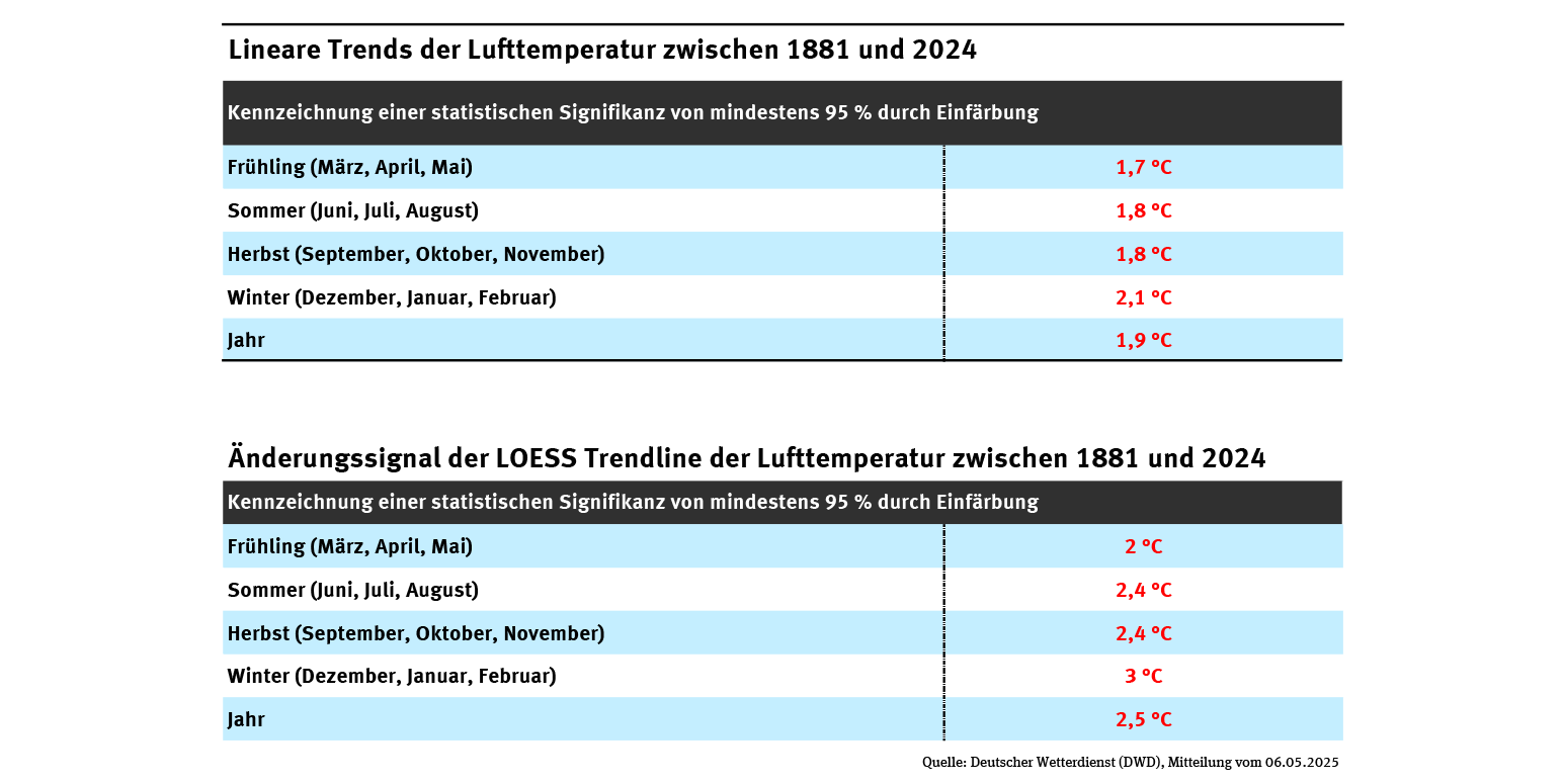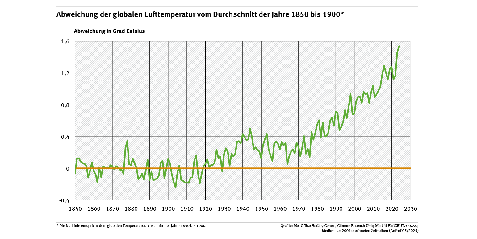 2024 war weltweit das wärmste Jahr seit Beginn der Wetteraufzeichnungen. Damit stellen die letzten zehn Jahre die weltweit wärmsten dar (siehe Abb. „Abweichung der globalen Lufttemperatur vom Durchschnitt der Jahre 1850 bis 1900“). Die Jahre 2016 und 2015 waren, neben dem Klimawandel, durch ein außergewöhnlich starkes El-Niño-Ereignis geprägt, das hohe globale Temperaturen begünstigt. Die Jahre 2017 - 2022 waren die bisher wärmsten Jahre seit Beginn der ausreichend umfangreichen Aufzeichnungen im Jahr 1850, die nicht in einem El-Niño-Ereignis lagen. Ab Sommer des Jahres 2023 begann ein neues El-Niño-Ereignis. Dieser El Niño allein kann aber nicht die extremen Rekordtemperaturen im Jahr 2023 und 2024 erklären.