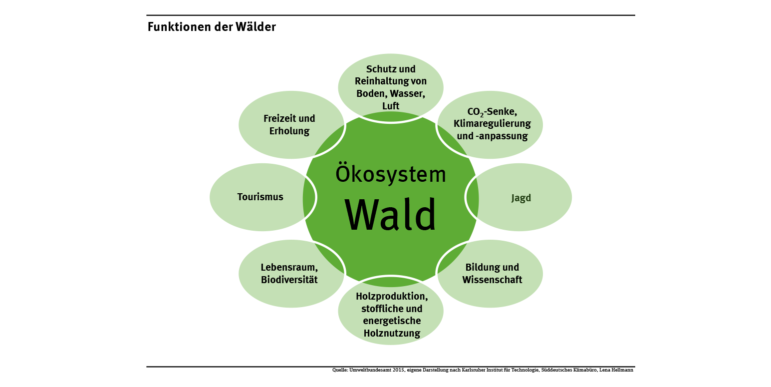 Nach den Ergebnissen der dritten Bundeswaldinventur 2011/2012 ist Deutschland mit rund 11,4 Millionen Hektar (Mio. ha) etwa zu einem Drittel mit Wald bedeckt. Der Wald erfüllt zahlreiche Funktionen für Mensch und Natur – vielfach gleichzeitig und auf derselben Fläche (siehe Schaubild „Funktionen der Wälder“).