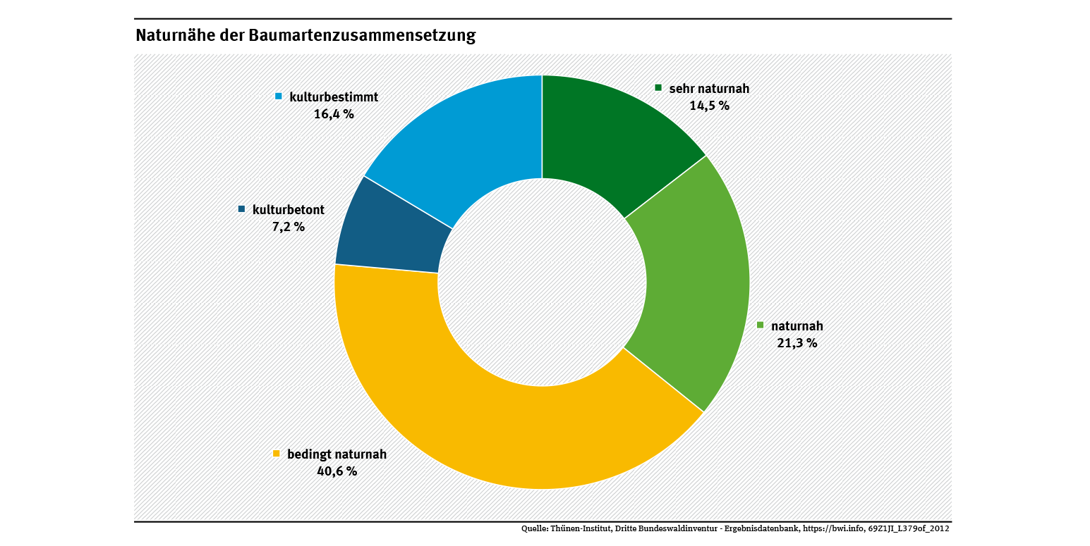 Nach den Ergebnissen der dritten Bundeswaldinventur 2011/2012 sind rund 36 % der Waldfläche als sehr naturnah (14,5 %) oder als naturnah (21,3 %) einzustufen (siehe Abb. „Naturnähe der Baumartenzusammensetzung“). Der Anteil naturnaher Waldflächen liegt dabei im Staatswald mit 40 % deutlich über dem Anteil der naturnahen Waldflächen im Privatwald (30,5 %).