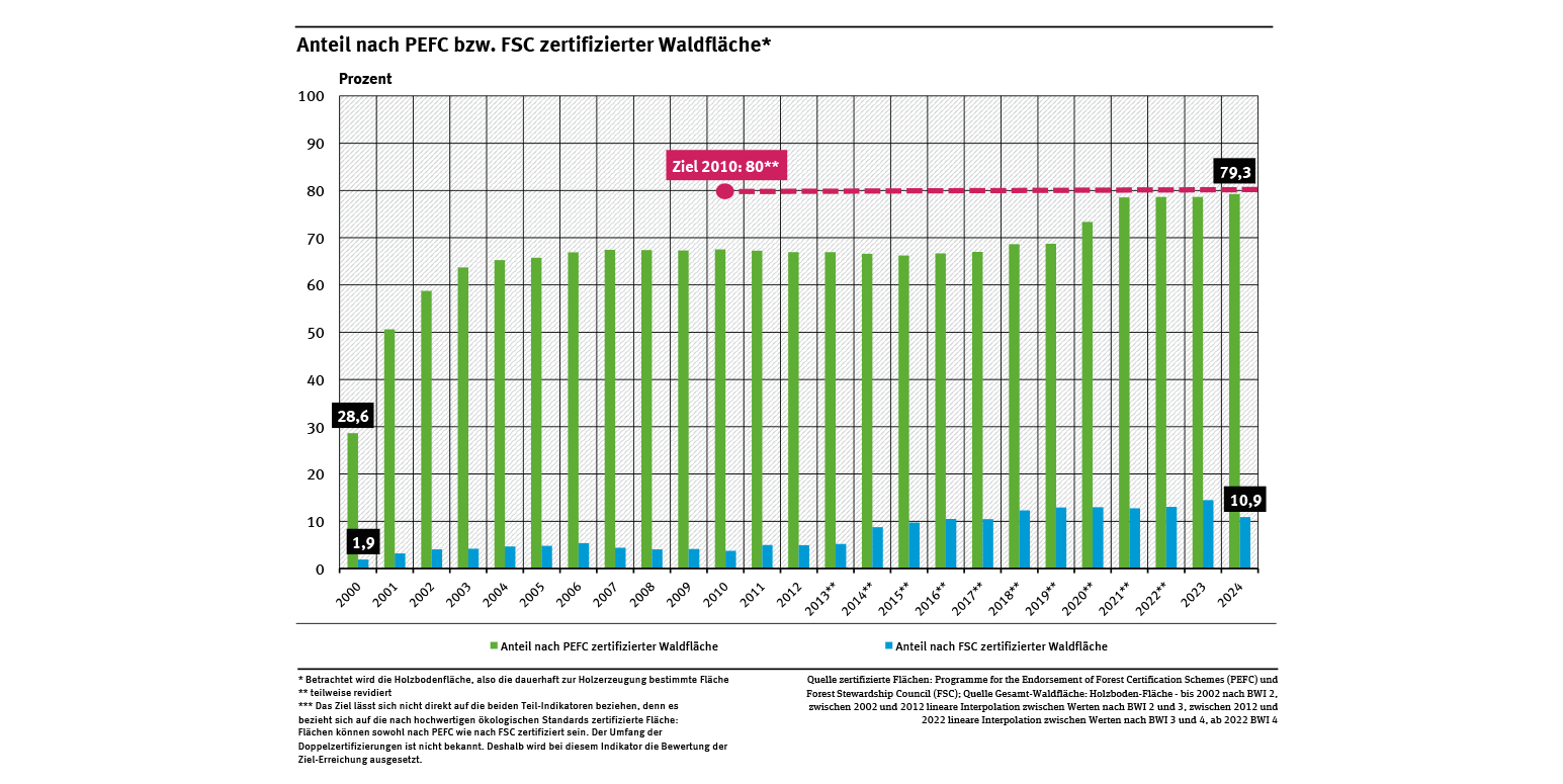 Der Anteil der nach PEFC und FSC zertifizierten Waldfläche an der Gesamtwaldfläche wird als Indikator der Nationalen Strategie zur biologischen Vielfalt verwendet. Es ist dabei zu beachten, dass Waldflächen sowohl nach PEFC als auch nach FSC zertifiziert sein können und das Ausmaß der Überschneidung nicht ermittelbar ist. Ferner sind die nach Naturland zertifizierten Flächen in den Zahlen des FSC enthalten.