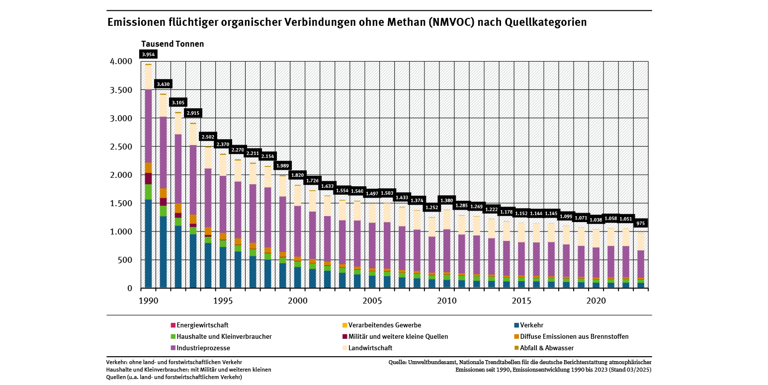 Von 1990 bis 2023 konnten die NMVOC-Emissionen von 3,9 Millionen Tonnen (Mio. t) auf knapp unter 1 Mio. t gesenkt und somit um 75,3 % zurückgeführt werden (siehe Abb. „Emissionen flüchtiger organischer Verbindungen ohne Methan (NMVOC) nach Quellkategorien“). Der Rückgang lässt sich in erster Linie mit der Entwicklung der Emissionen aus dem Straßenverkehr sowie bei den Lösemittelanwendungen im industriellen und gewerblichen Bereich erklären.