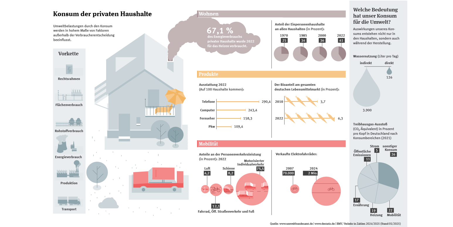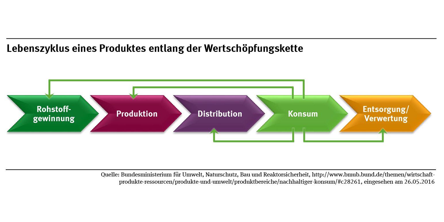 Informationen zum Ressourcenverbrauch über den gesamten Produktions- und Verbrauchszyklus sind deshalb notwendig, um in allen Phasen die effektivsten Maßnahmen zur Reduktion der negativen Umweltauswirkungen ergreifen zu können (siehe Schaubild „Lebenszyklus eines Produktes entlang der Wertschöpfungskette“). Unterstützt werden eigenverantwortliche, umweltbewusste Verbraucherentscheidungen durch Prüfsiegel und Umweltzeichen. Nachhaltige Umweltpolitik muss durch gezielte Maßnahmen auch ein nachhaltiges Konsumverhalten ermöglichen. Nachhaltiger Konsum heißt vor allem: bewusst konsumieren, genauer hinschauen und die eigene "Gesamtbilanz" im Auge haben. Genau hier liegt das große Potenzial: denn nachhaltiger Konsum und die nachhaltige Herstellung von Produkten sind ein Weg, um die Umweltbelastungen zu begrenzen – und weiter zu verringern.