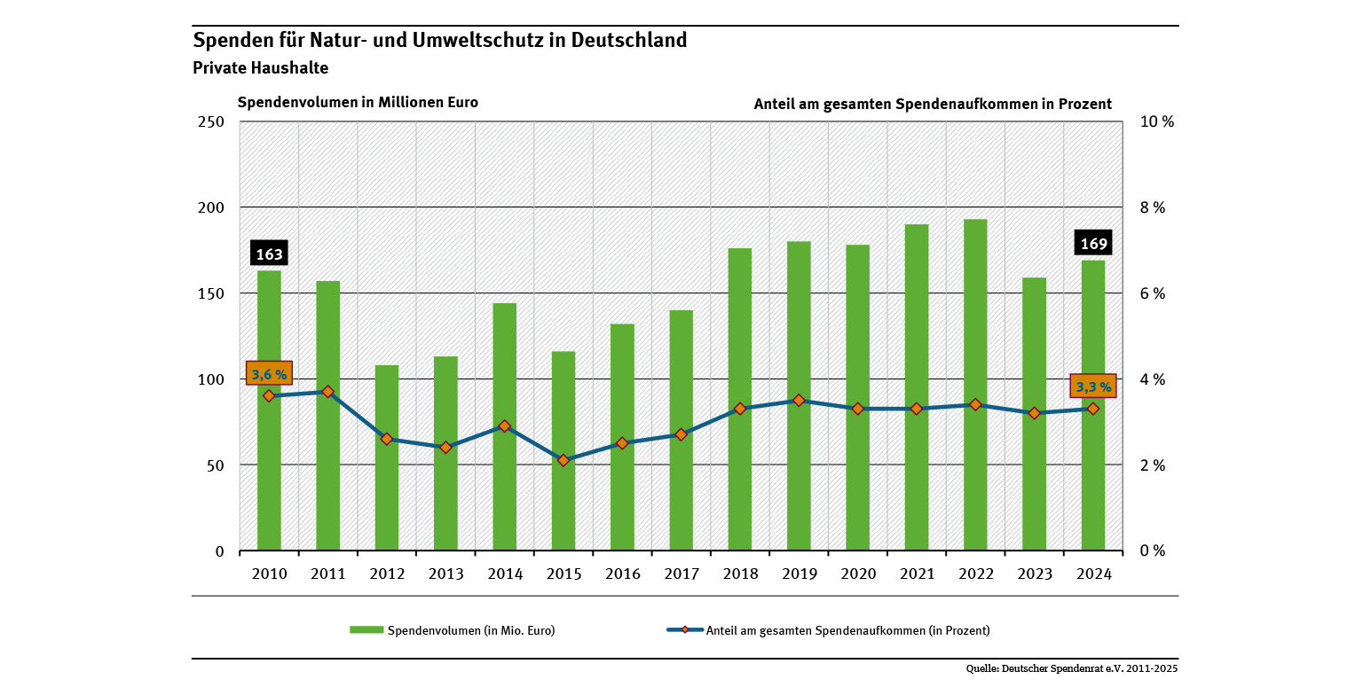 Die Ausgaben von privaten Haushalten für Spenden für Umwelt- und Naturschutz schwankte seit 2010 zwischen 108 Millionen Euro (2012) und 193 Millionen Euro (2022). Der Anteil am gesamten Spendenaufkommen privater Haushalte lag zwischen 2,1 % (2015) und 3,7 % (2011). Im Jahr 2024 lag der Anteil bei 3,3 % (siehe Abb. „Spenden für Natur- und Umweltschutz in Deutschland“). Die Daten werden über ein Panel von deutschen Privatpersonen ab 10 Jahren monatlich erfasst (Deutscher Spendenrat). Nicht enthalten sind u.a. Spenden an politische Parteien, Spenden von Unternehmen und Organisationen sowie Großspenden über 2.500 Euro.
