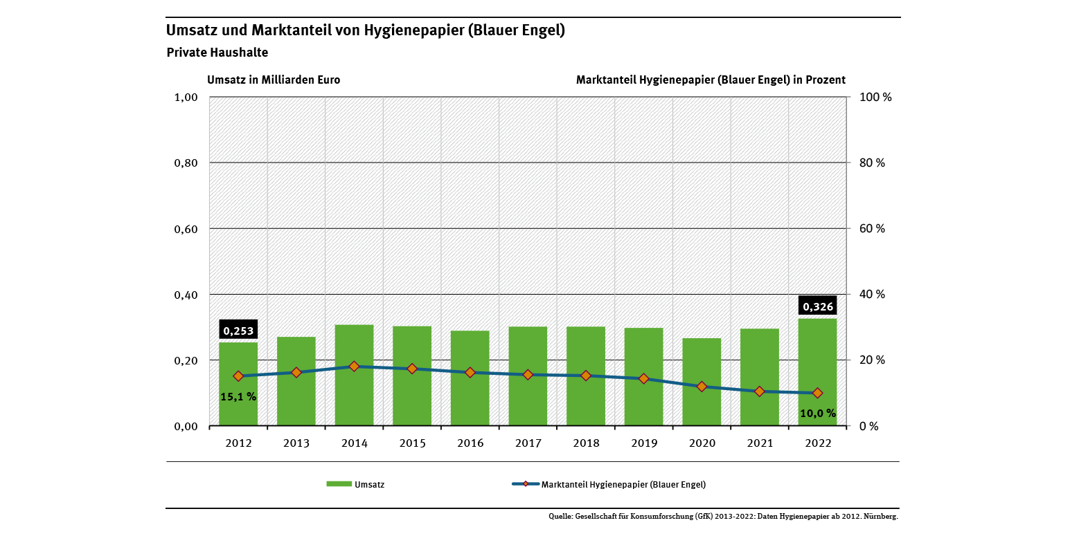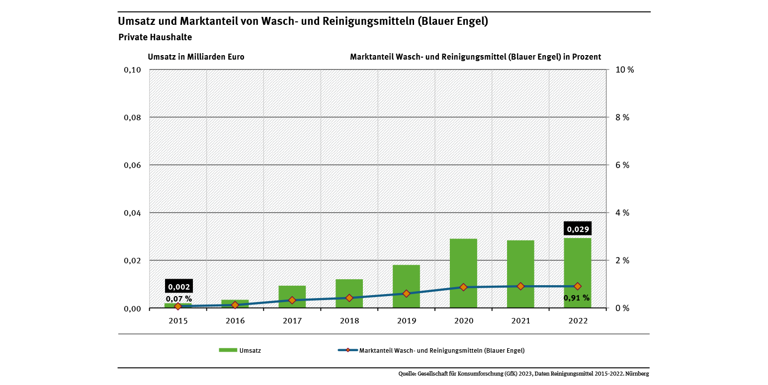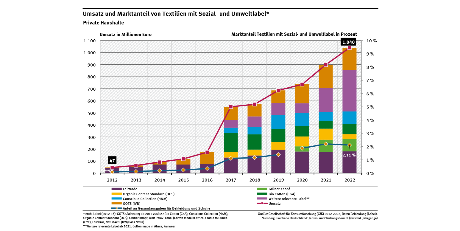Der Marktanteil von Textilien und Bekleidung mit einem Sozial- und Umweltlabel betrug im Jahr 2022 rund 2,11 % (siehe Abb. „Umsatz und Marktanteil von Textilien mit Sozial- und Umweltlabel“). Bis 2016 enthält die Abbildung nur die Daten der Label GOTS und Fairtrade. Ab 2018 sind auch die Daten weiterer Umweltlabel berücksichtigt, ab 2020 auch Daten für das neue staatliche Siegel „Grüner Knopf“. Die Daten stammen aus einem Verbraucherpanel der Gesellschaft für Konsumforschung (GfK).