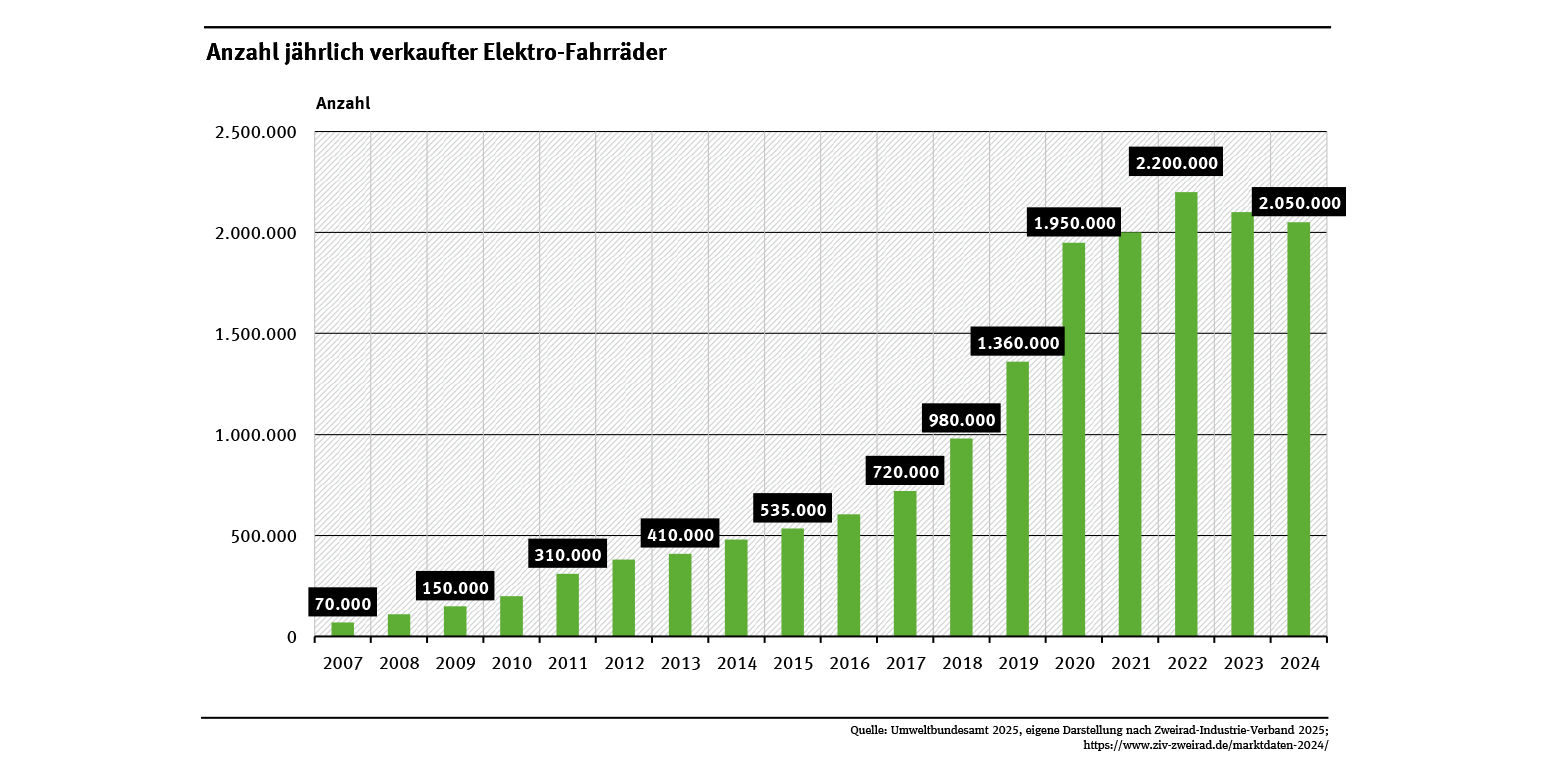 2024 wurden 3,85 Millionen (Mio.) Fahrräder und Elektro-Fahrräder in Deutschland verkauft. Wie schon in den vorherigen Jahren hatten die Fahrräder mit einem Elektro-Motor den größeren Anteil (siehe Abb. „Anzahl jährlich verkaufter Elektro-Fahrräder“). Die Gründe für die Zunahme der E-Bikes sind vielfältig: zum einen gibt es eine breite Palette an Designmodellen, zum anderen verbesserte sich durch Weiterentwicklung die Antriebs- und Batterietechnik. Nach Schätzungen des Zweirad-Industrie-Verbandes umfasst der Fahrradbestand in Deutschland zum Ende des Jahres 2024 insgesamt ca. 89 Mio. Fahrräder und E-Bikes. Letztere hatten daran einen Anteil von geschätzt 15,7 Mio. Einheiten.