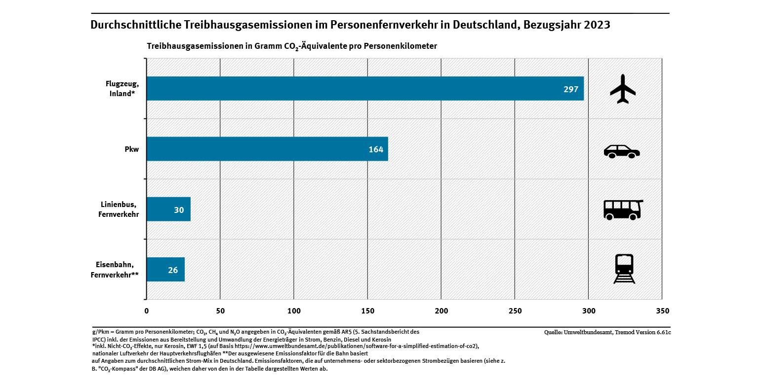 Pkw und Motorrad waren im Jahr 2023 die beliebtesten Fortbewegungsmittel für Urlaub und Freizeit. Dann folgen das Flugzeug und die Bahn. Pkw und Flugzeug sind im Fernverkehr jedoch die Verkehrsmittel mit den höchsten Treibhausgasemissionen pro Personenkilometer (siehe Abb. „Durchschnittliche Treibhausgasemissionen im Personenfernverkehr, Bezugsjahr 2023“).