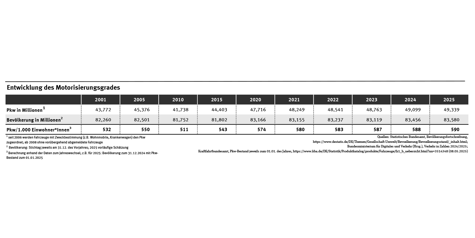 Der Motorisierungsgrad in Deutschland hat in den letzten Jahren stetig zugenommen. Waren es im Jahr 2010 noch 511 Pkw pro 1.000 Einwohner*innen, ist diese Zahl mittlerweile auf 590 im Jahr 2025 angestiegen (siehe Tab. „Entwicklung des Motorisierungsgrades“). Ein hoher Motorisierungsgrad bedeutet aber nicht zwangsläufig, dass alle Menschen sehr mobil sind und ihre Ziele gut erreichen. Umgekehrt erfordert Mobilität und Erreichbarkeit oftmals keinen hohen Motorisierungsgrad. So ist der Motorisierungsgrad in Städten allgemein niedriger, da dort Ziele auch gut zu Fuß, per Rad und mit öffentlichen Verkehrsmitteln erreichbar sind. Die Förderung dieser umweltfreundlichen Fortbewegungsarten kann den weiteren Anstieg der Motorisierung bremsen oder sogar den Motorisierungsgrad wieder senken. Auch das Carsharing – und damit der Wandel vom „Autobesitz“ zur „Autonutzung“ – kann einen Beitrag dazu leisten.