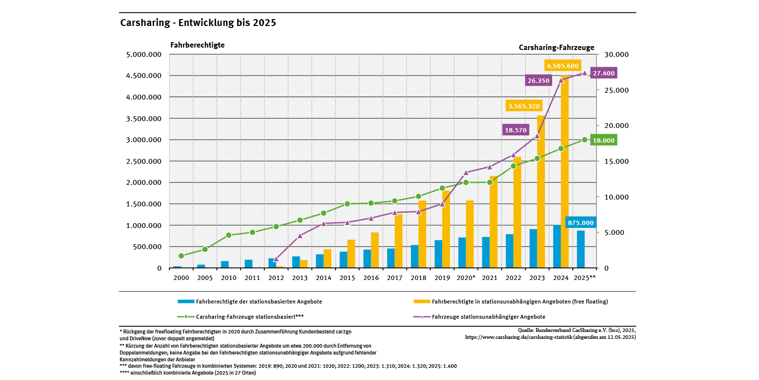 Diagramm: Zum 01.01.2025 betrug die Zahl der Fahrberechtigten für stationsbasierte Angebote 875.000 und die Zahl der stationsbasierten Fahrzeuge lag bei 18.000. Carsharing – Entwicklung bis 2025