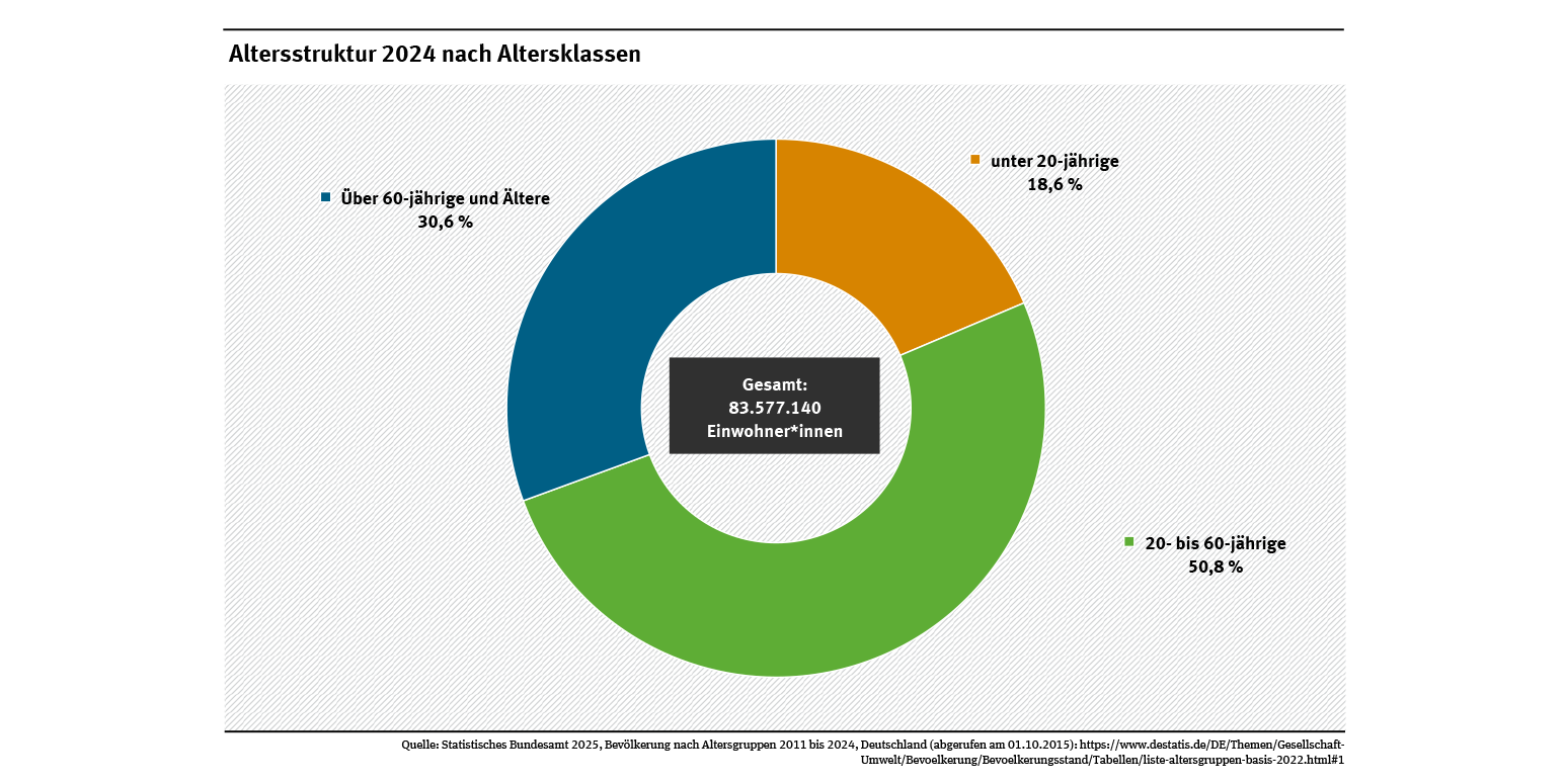 Die Zahlen zur Altersstruktur zeigen: 2024 betrug der Anteil der unter 20-Jährigen 18,6 %. Auf die Bevölkerung im Alter von 20 bis 60 Jahren entfielen 50,8 % und der Anteil der über 60-jährigen lag bei 30,6 % (siehe Abb. „Altersstruktur 2024 nach Altersklassen“). Die abnehmende Zahl der Geburten und das Altern der gegenwärtigen stark besetzten mittleren Jahrgänge führen zu Veränderungen in der Altersstruktur der Bevölkerung. Eine klassische Bevölkerungsstruktur, bei der die Kinder die stärksten Jahrgänge stellen und die Besetzungszahlen der älteren Jahrgänge allmählich als Folge der Sterblichkeit abnehmen, zeigt die aktuelle Bevölkerungspyramide in Deutschland nicht mehr auf. Laut Statistischem Bundesamt hat die Zuwanderung nur sehr eingeschränkte Auswirkungen auf die langfristige Bevölkerungsentwicklung. Sie schlägt sich vor allem im kurzfristigen Anstieg der Bevölkerungszahl nieder. Der Trend einer zunehmenden Alterung der Gesellschaft in Deutschland kann dadurch voraussichtlich nicht umgekehrt werden.
