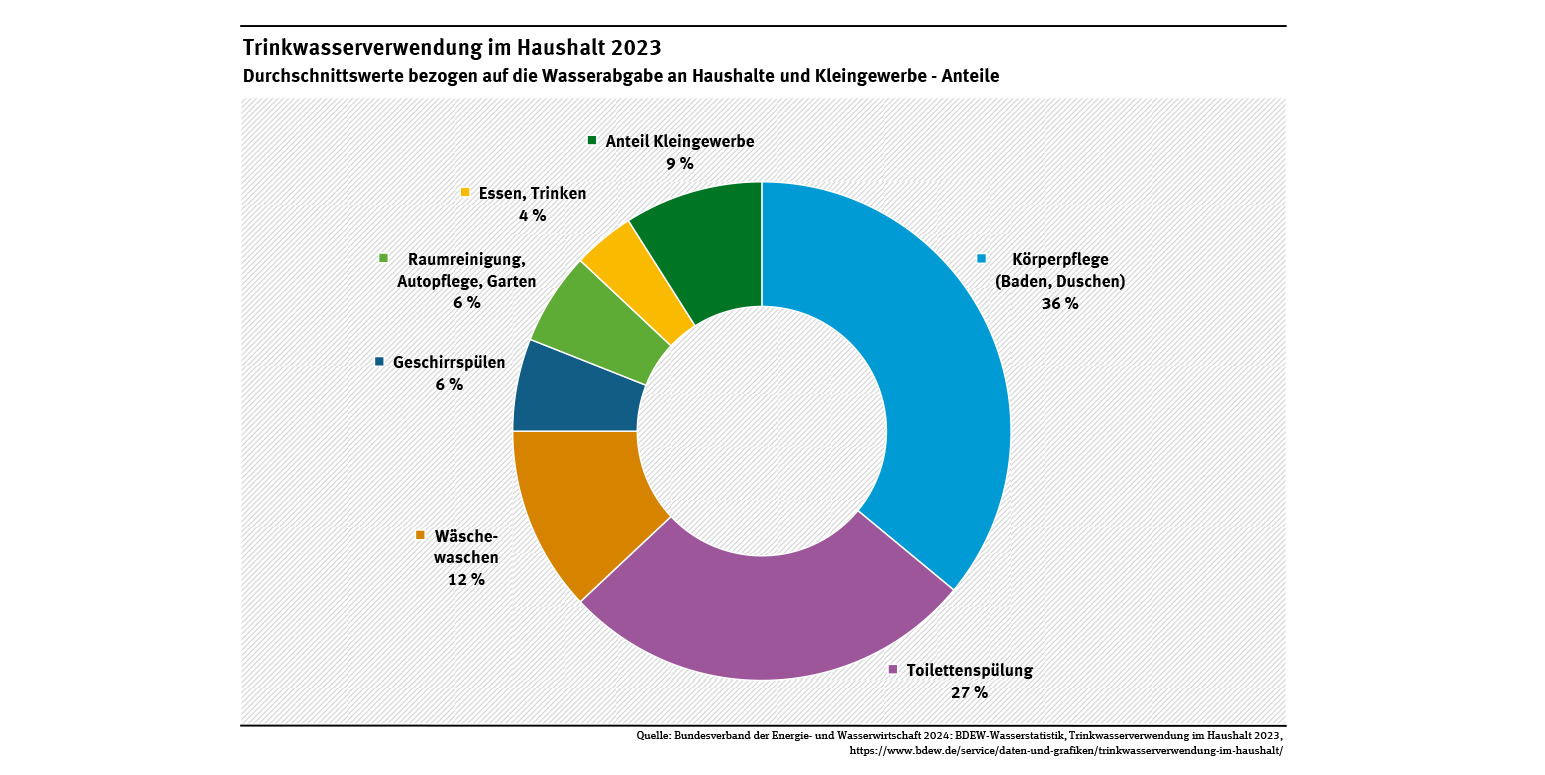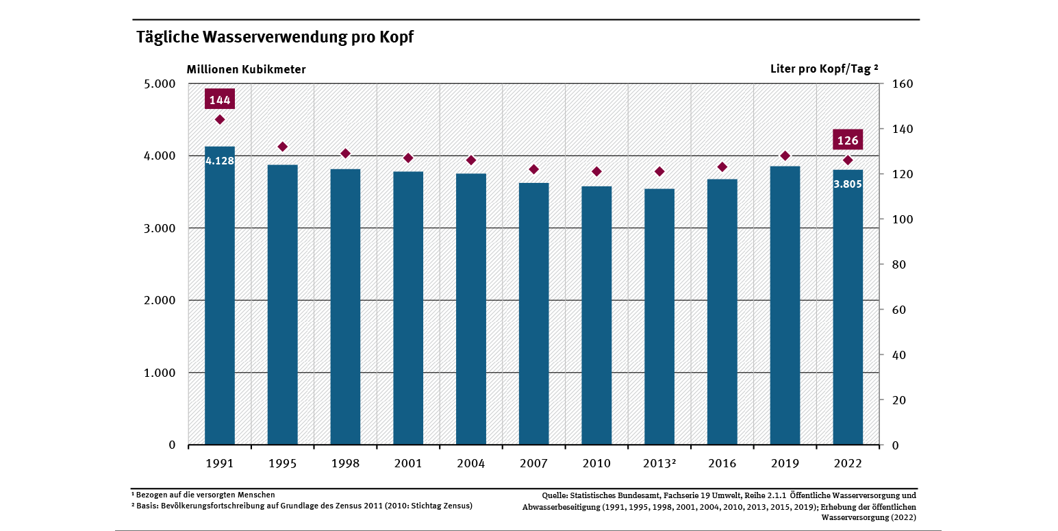 Bei einem Wasserfußabdruck von 219 Milliarden Kubikmetern hinterlässt jede Person in Deutschland durch ihren Konsum einen Wasserfußabdruck von rund 2.628 Kubikmetern jährlich – das sind 7,2 Kubikmeter oder 7.200 Liter täglich. 86 % des Wassers, das man für die Herstellung der in Deutschland konsumierten Waren benötigt, wird im Ausland verbraucht. Für Kleidung sind es sogar nahezu 100 %.