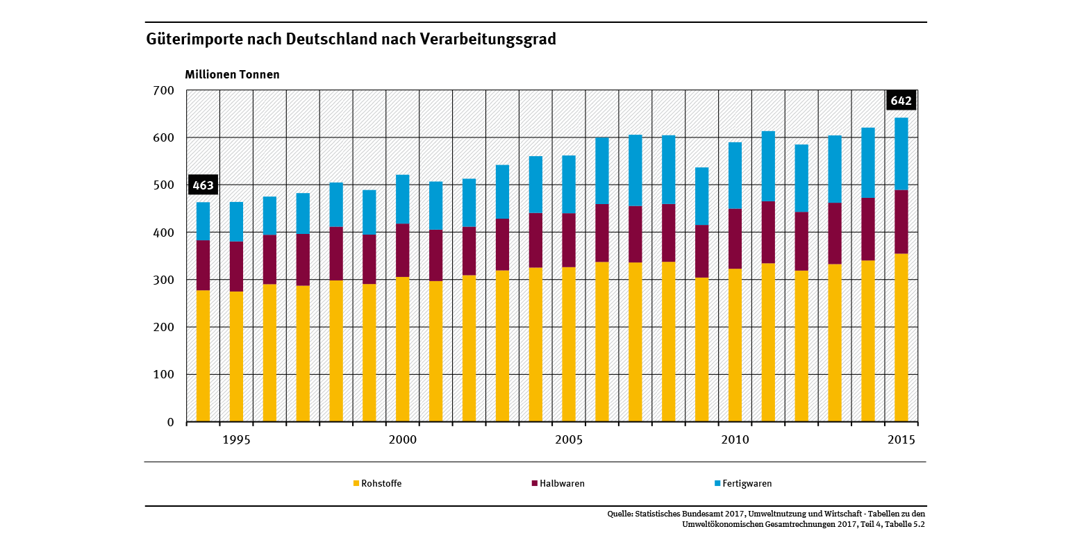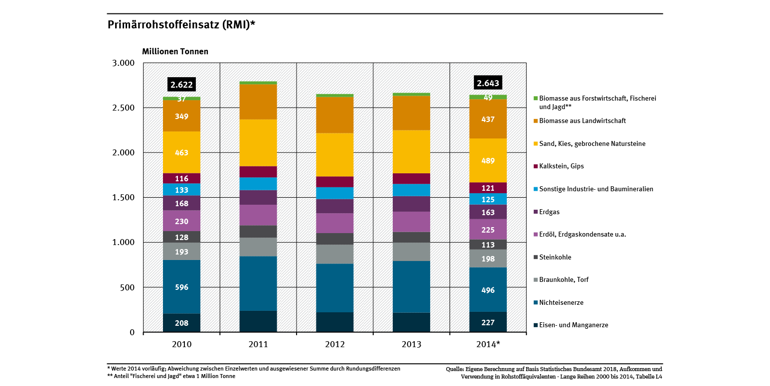 In Deutschland wurden der Natur im Jahr 2015 insgesamt 1.041 Millionen Tonnen (Mio. t) an Rohstoffen entnommen (siehe Abb. „Inländische Rohstoffentnahme“).