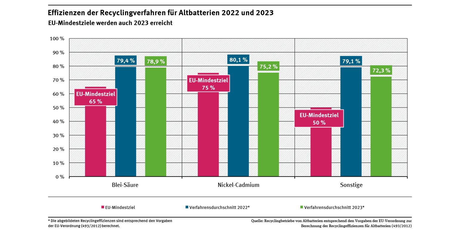 Im Ergebnis belegen die aktuellen Daten, dass sowohl Sammlung als auch Sortierung – zur Sicherstellung des Altbatterierecyclings – etabliert sind und Recyclingbetriebe, die zugeführten Altbatterien über die Mindestziele hinaus recyceln.
