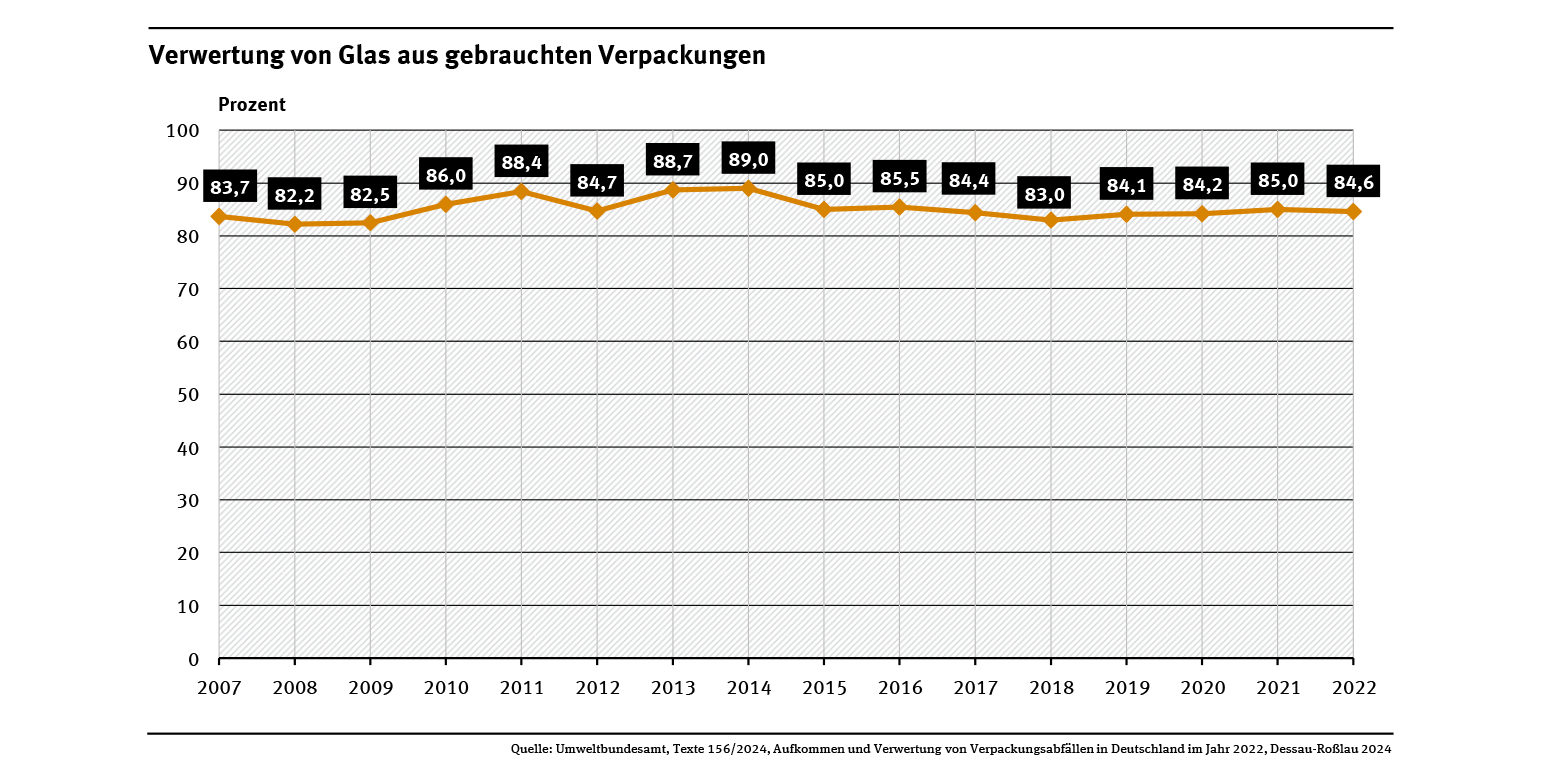 Diagramm: Zwischen 2007 und 2022 schwankte die Verwertungsquote von Glas aus gebrauchten Verpackungen zwischen 83,7 auf 84,6 Prozent, mit einem Tiefstwert von 82,2 Prozent im Jahr 2018 und einem Maximum von 89 Prozent im Jahr 2014. Verwertung von Glas aus gebrauchten Verpackungen