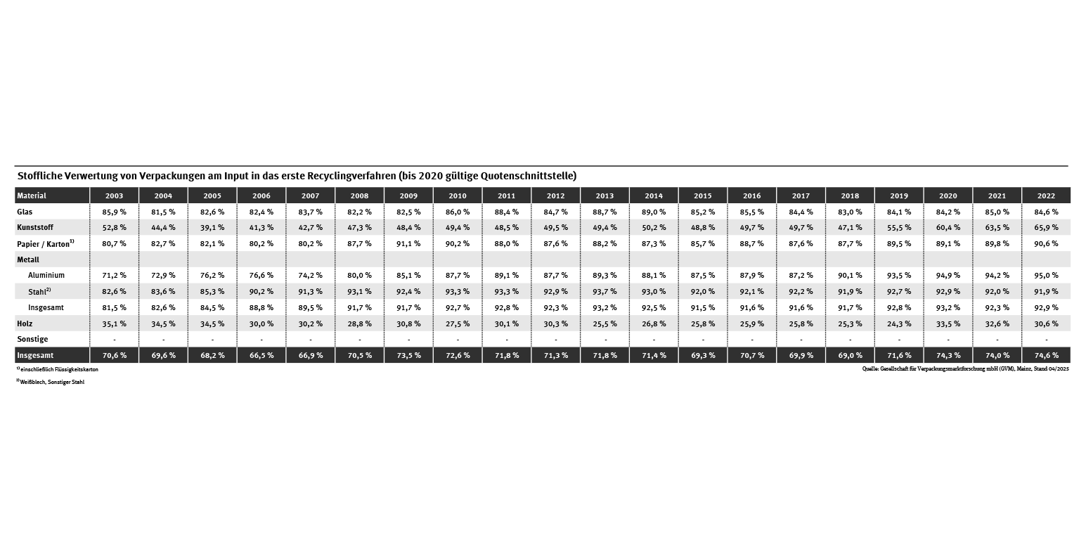 Von den im Jahr 2022 in Deutschland angefallenen Verpackungsabfällen sind nach alter Berechnungsmethode 97,1 % stofflich oder energetisch verwertet worden. Die Verwertungsquote aller Verpackungsabfälle ist damit im Vergleich zum Vorjahr um 0,1 Prozentpunkte gefallen (siehe Tab. „Verwertung von Verpackungen (stofflich oder energetisch an der bis 2020 gültigen Quotenschnittstelle)“). Die stoffliche Verwertungsquote der Verpackungsabfälle stieg nach der alten Berechnungsmethode im Jahr 2022 um 0,6 % Prozentpunkte auf 74,6 % (siehe Tab. „Stoffliche Verwertung von Verpackungen am Input in das erste Recyclingverfahren (bis 2020 gültige Quotenschnittstelle)“). Das ist im Vergleich zu anderen EU-Mitgliedsstaaten eine sehr gute Quote.