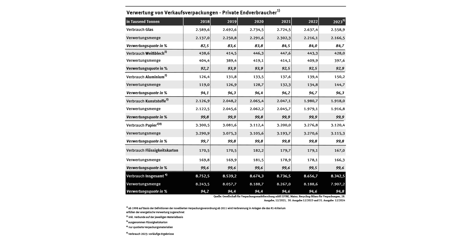 Tabelle: Von etwa 8,3 Millionen Tonnen an Verkaufsverpackungen für private Verbraucher wurden im Jahr 2023 94,8 Prozent verwertet. Im Jahr 1991 waren es gut 37 % von mehr als 7,6 Millionen Tonnen. Die Verwertungsquoten stiegen seitdem bei allen Verpackungsarten. Tab: Verwertung von Verkaufsverpackungen – Private Endverbraucher